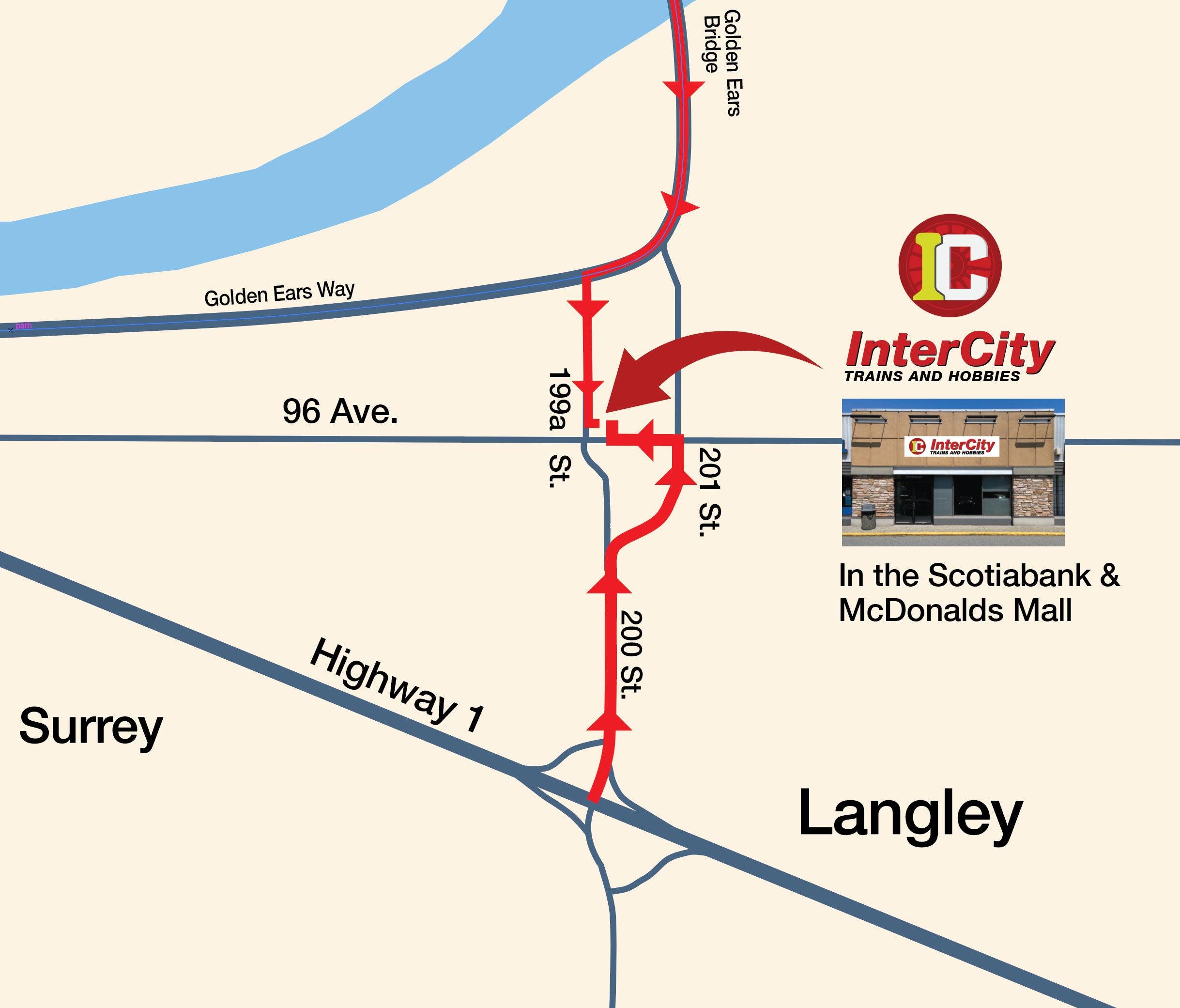 Our retail store is located only a few minutes north of highway 1 in Langley BC. Take the 200 St. exit and head north for about 2 km. Turn left onto 96 Ave and turn into the Scotiabank / McDonalds plaza where we are located.