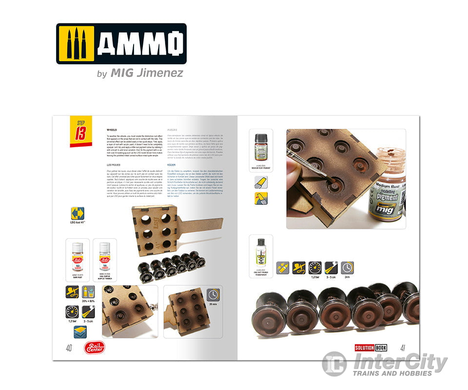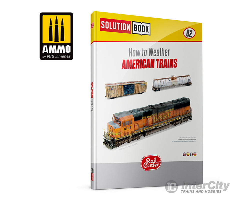 RAIL CENTER SOLUTION BOOK - How to Weather American Trains. A complete guide with step-by-step tutorials in four languages (English, Spanish, French, and German) explaining how to apply the different colours and effects common to US rolling stock. By following the steps in this guide, you will be able to obtain amazing results with the efficient and effective methods shown. SOLUTION BOOK is a simple and basic guide intended to help any modeller easily achieve similar results to those shown in each example. It doesn´t matter if the reader is a novice or a more seasoned and experienced modeller, by following the steps in this guide you will be able to obtain amazing results with the efficient and effective methods shown.