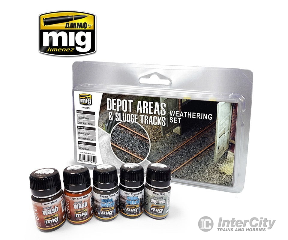 Set specially designed for weathering all types of areas of railroad depots and maintenance areas, water or coal depots, diesel or steam locomotive maintenance areas, or for tracks in maneuvering zones, with a lot of use or even abandoned in industrial areas. You can make rust effects, old metal effects, dirt in general and many other effects that we usually see in railway stations.