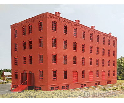 Based on a well-known 1883-built landmark in New Jersey that continued operations until well into the 1990s. The four-story brick building features eight chimneys, a loading dock, elevator tower, boxcar loading doors, entry stairway, optional bricked-in window blanks and window vents.