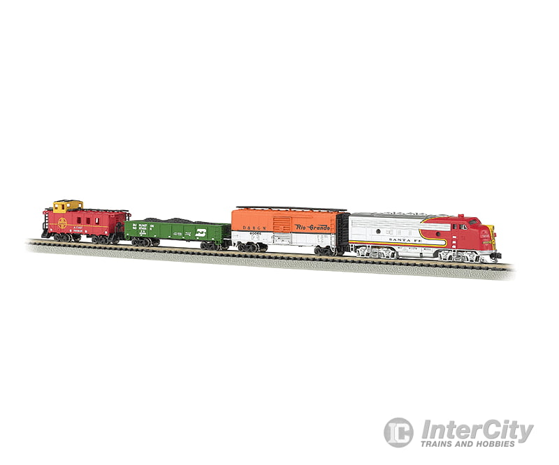 With the pride and power of a born leader, the mighty Super Chief thunders along the rails. Spearheading the charge is an F7-A diesel locomotive with the Santa Fe's distinctive red and silver War Bonnet paint scheme. Set includes locomotive, boxcar, gondola and caboose plus 24" circle of E-Z Track(R), power pack and speed controller.