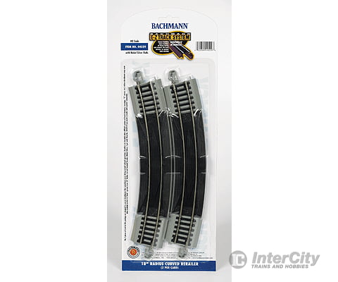 Whether for your first train set or for more advanced layouts Bachmann HO Scale E-Z Track makes setting up easy. Each section combines track and roadbed into a single piece, with snap-fit assembly and plug-in wiring to provide instant railroad fun. A hidden locking feature holds sections securely together until you're ready to take them apart. Easy to set up on any surface, including floors and rugs, no special tools, nails or boards are needed. Low-oxidation nickel-silver rail is easy to keep clean and corrosion free with normal indoor use and gray roadbed is similar in appearance to the real thing. E-Z Track molded black roadbed steel alloy track supplied with train sets is fully compatible with gray-roadbed nickel silver track. A great track system for Christmas displays or permanent layouts. As reference, 12 sections of curved 18" radius track make a full circle; 16 sections of curved 22" radius track make a full circle. See the wide variety of available Bachmann HO Scale E-Z Track roadbed-style track.