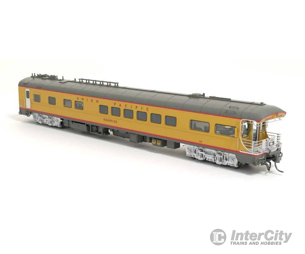The Broadway Limited HO Scale Business Car Observation is based Union Pacific Car #119, known as "Kenefick." Commonly found included in consists of Union Pacific's business car fleet, it has been roaming the Union Pacific system for decades. The car was built in 1950 as coach No. 5446. It was rebuilt to business car no. 99 in 1963 and officially named the Kenefick in 1988. Among the many miles car 119 has traveled, there have been several special occasions it has been a part of. Two of the most notable trips 119 took were when Big Boy 4014 traversed the country in 2019 and bringing up the rear of President George H.W. Bush's this detailed model of #119 is patterned after its 2000s appearance. The car boasts a lighted interior, marker lights, tail lights, and individually controllable ditch lights. The Kenefick model has era-specific decoration, antenna arrangement, appropriate trucks and underbody details, and other roof features. The model is loaded with detail inside and out complete with colored interiors. The cars are equipped with Kadee(R) magnetic knuckle couplers and will operate on 18" radius and larger curves, but larger curves are highly recommended. The Kenefick Business Car Observation is part of the line of Broadway Limited HO Scale passenger cars.