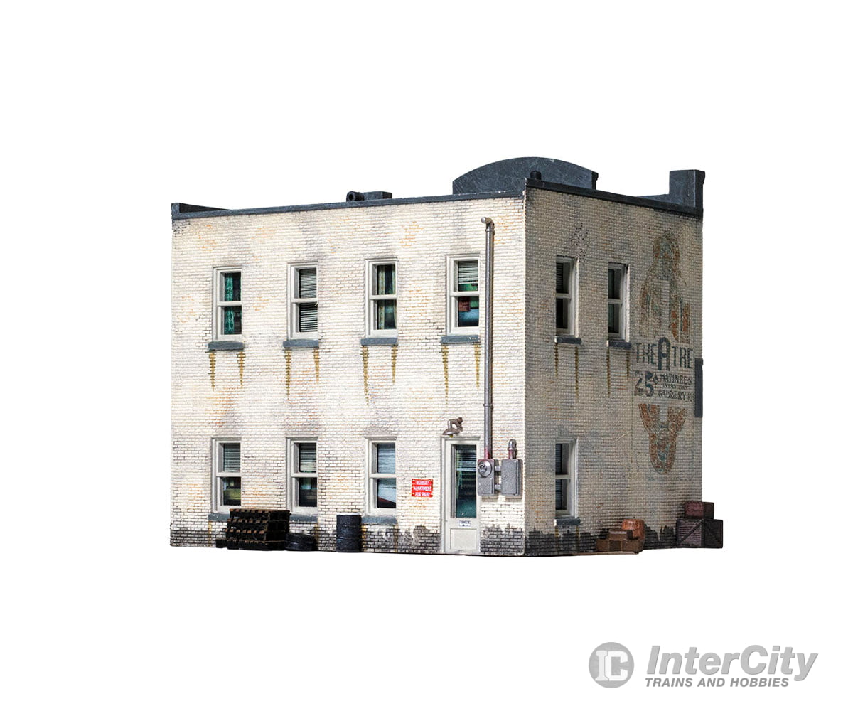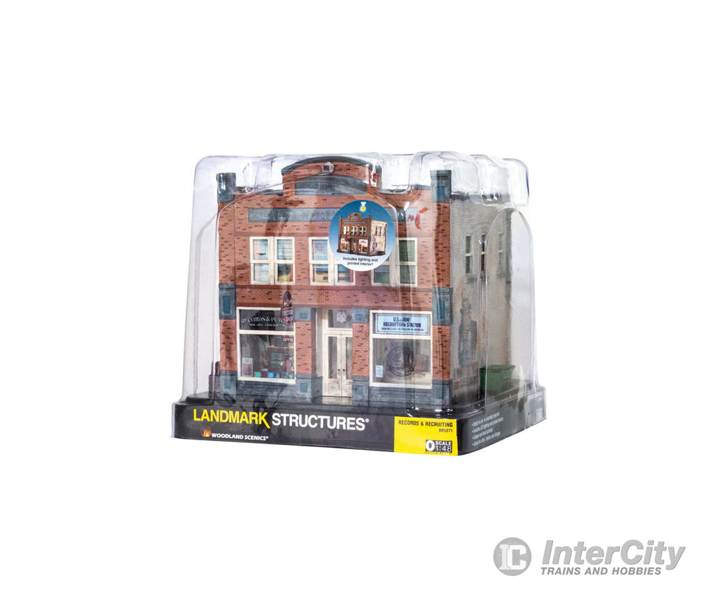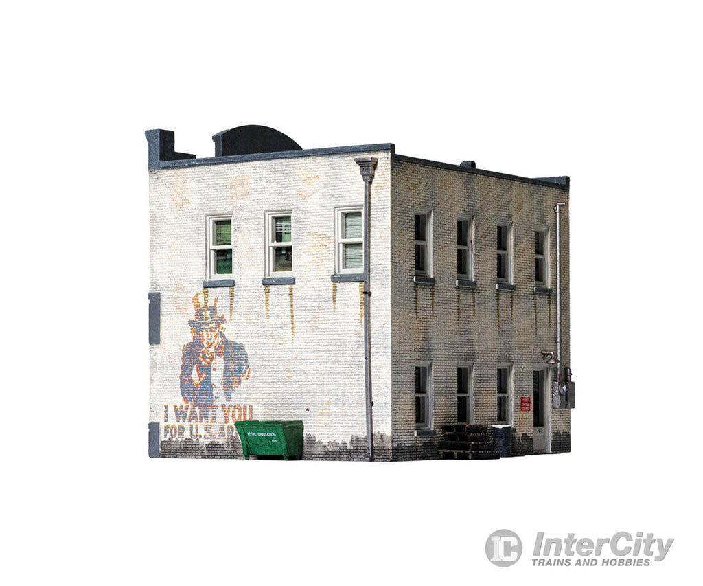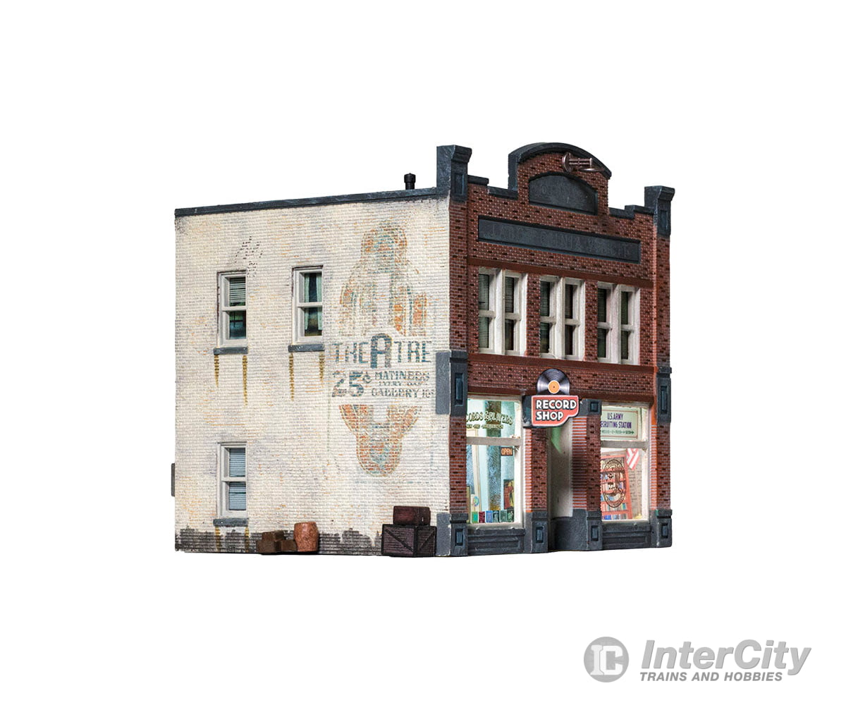 Whether you seek vinyl or valor, this O scale Built-&-Ready building is the place for you. The structure features eye-catching printed interiors of a record shop, an Army recruiting office and cozy apartments upstairs. Blinds cover the windows above the bustling businesses. It is hand-painted and authentically weathered. There are also exterior details like crates and barrels, as well as decals and signage.