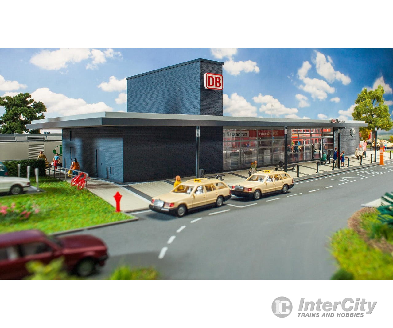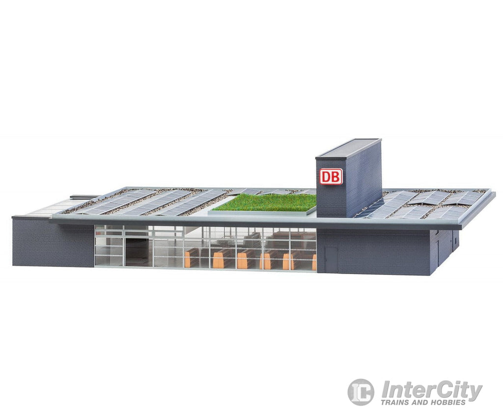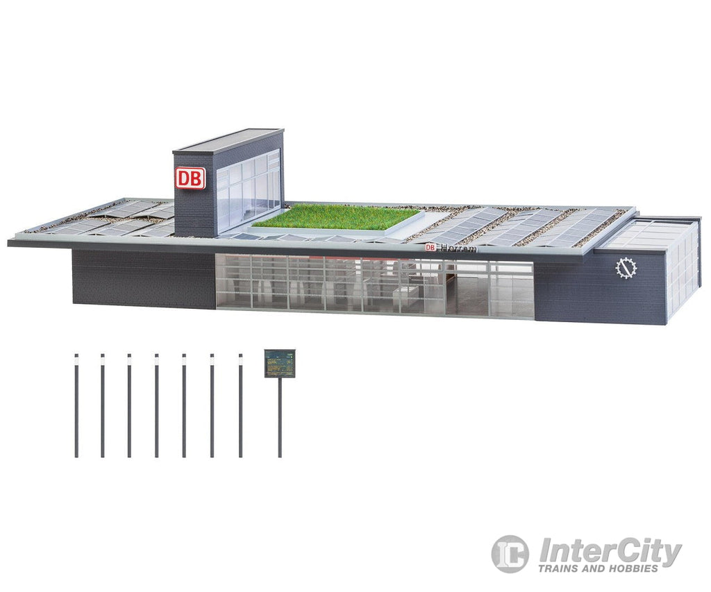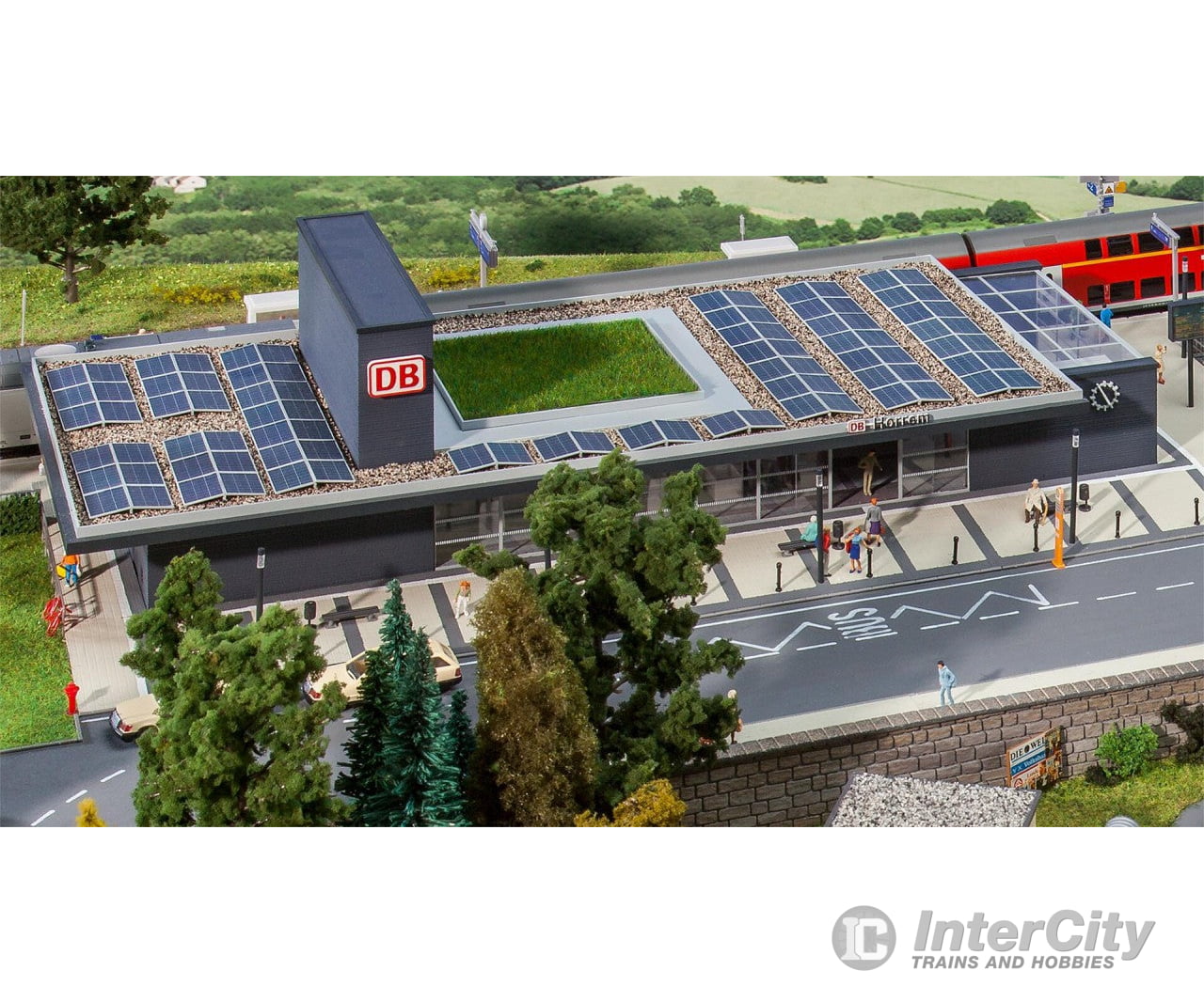 New standards for the station building on your model railway installation! Faithful reproduction of the original »Green Station« built in Kerpen-Horrem in North Rhine-Westphalia on the regional express line connecting Cologne and Aachen. That lighthouse project of DB Station&Service AG is the first station to be built to combine holistically the three aspects environment, energy and climate. While the clear structure and the reserved tone of the slate building leave the trains the privilege of being the real stars, the large-area glazed facade and roof provide transparency and ideal daylight penetration for the travellers present in the central hall without any supporting pillar and its waiting area. The photo-voltaic installation making use of solar energy as well as the grassing of the roof surfaces of varying overhanging length round off that successful ecological model. Seats, modern lampposts and train destination indicators also form part of the kit.