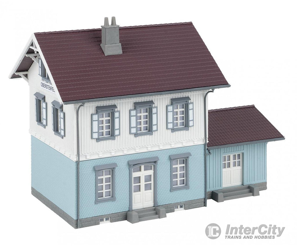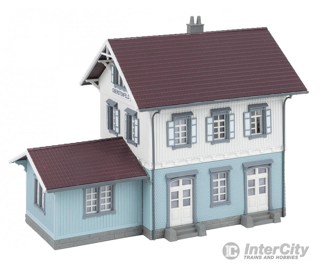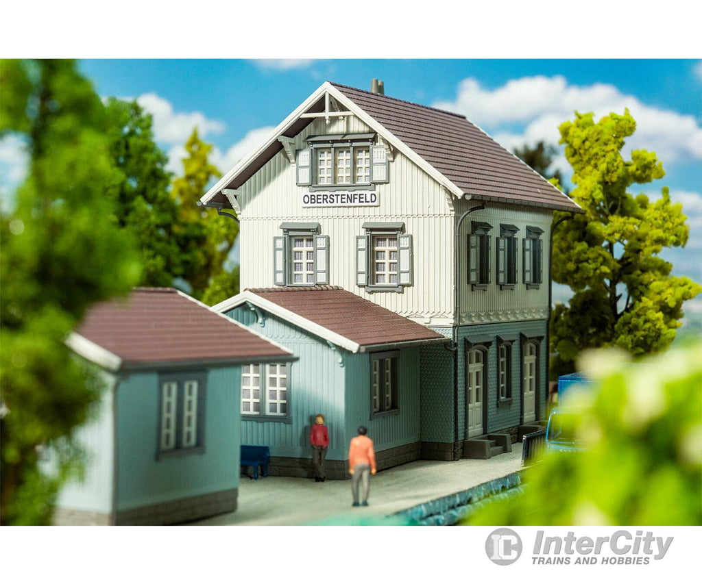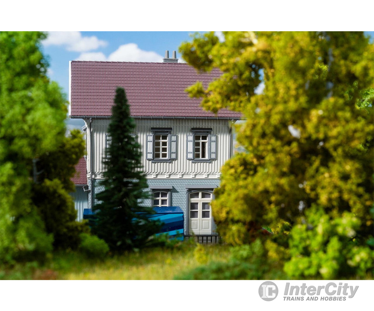 The train slowly rolls onto the track and the passengers on the platform prepare for departure. The station with its light blue and white wooden façade, modelled on the original Oberstenfeld station, is a real eye-catcher on the model layout. Oberstenfeld is located on the Bottwartal railway between Marbach and Heilbronn. Following the closure of the railway, the station was restored and now serves as a local community meeting place. It embodies the charm of a typical small-town railway station, full of loving details that give it a special character.