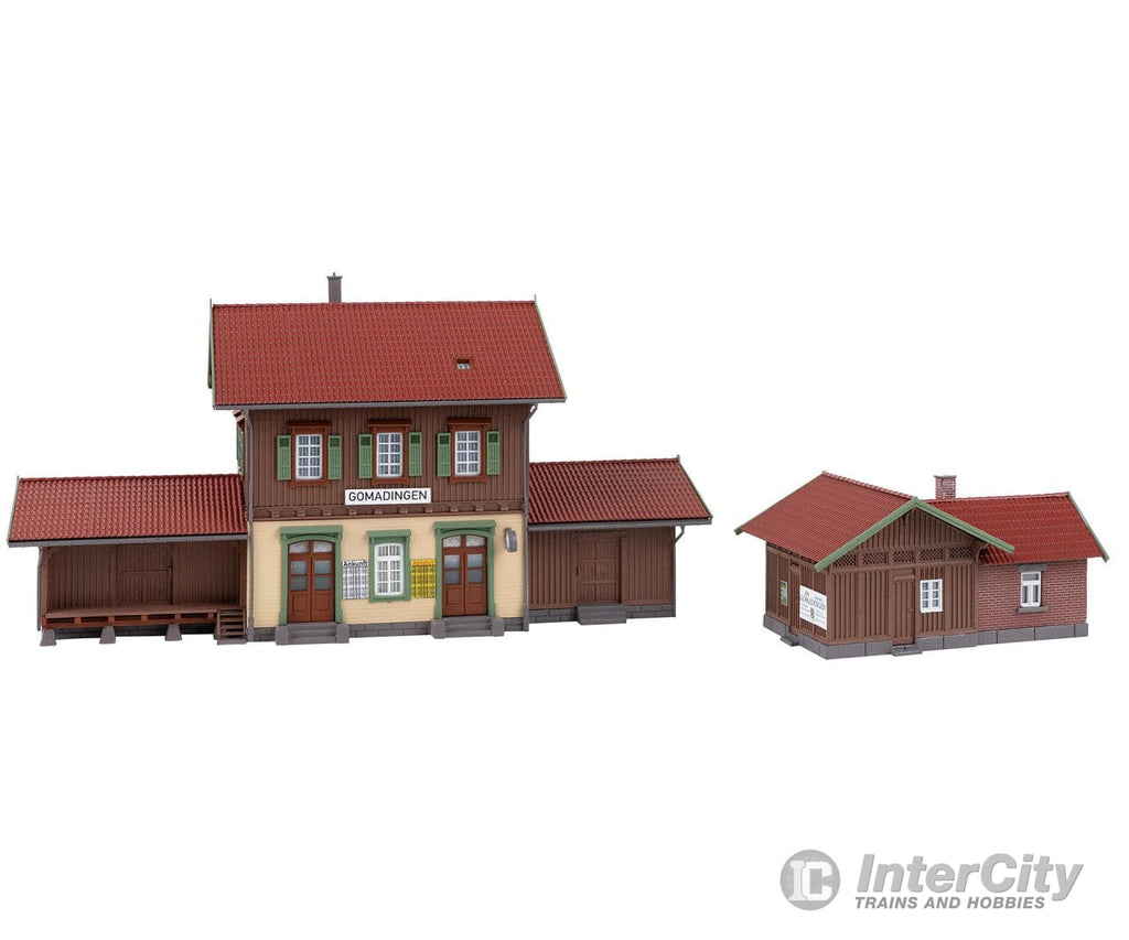 On the Schwäbische Alb-Bahn railway line Type IIa railway station of the Royal Württemberg State Railways based on the original in Gomadingen near Reutlingen. The two-storey station building with ticket office and company flat is clad in wood and shingles. The facades of the attached waiting room and the goods shed have wood sidings. The privvy and wood rack are housed in a separate building.