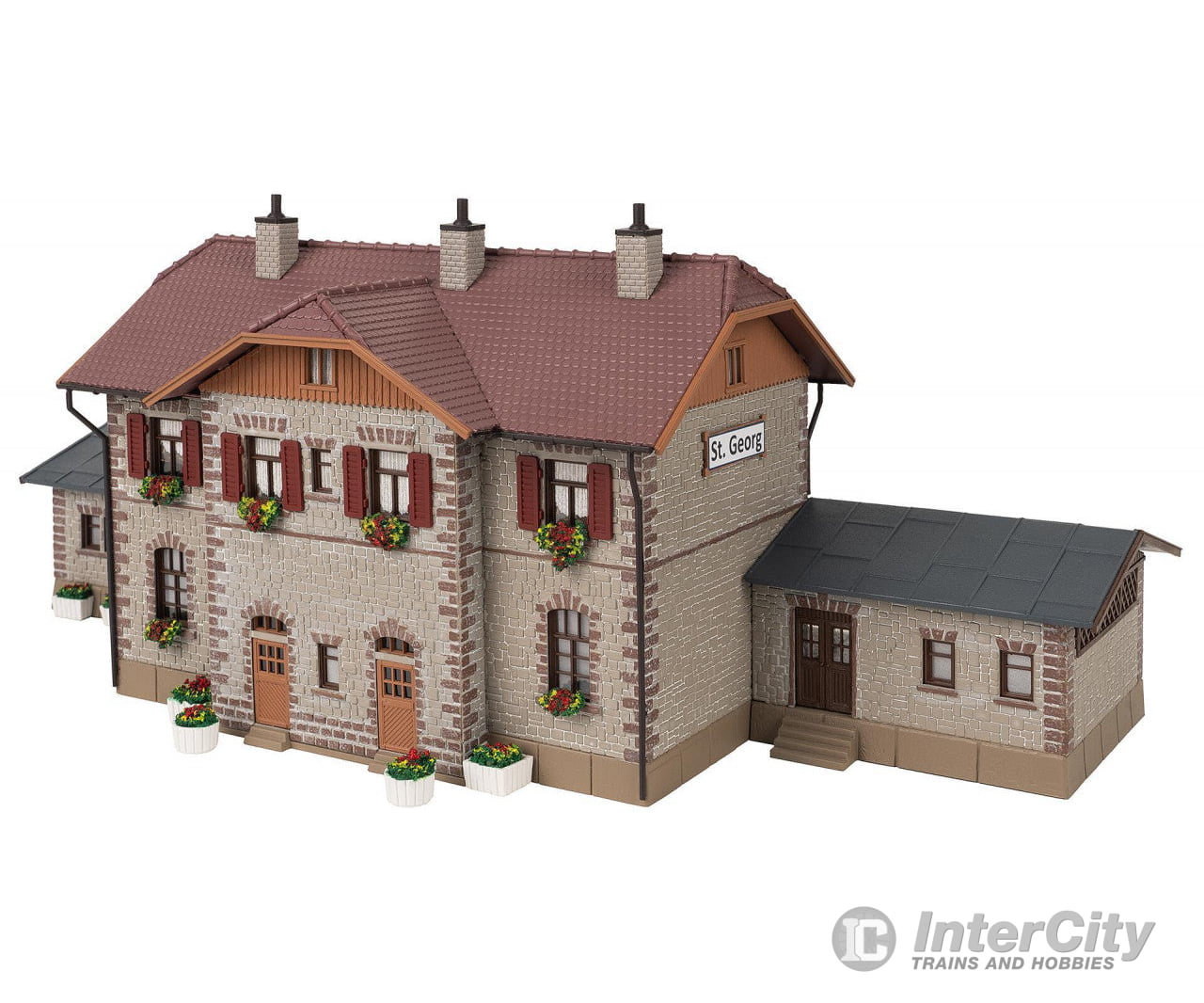 Typical small-town railway station in natural stone. Lavishly equipped with a covered platform and matching waiting benches.