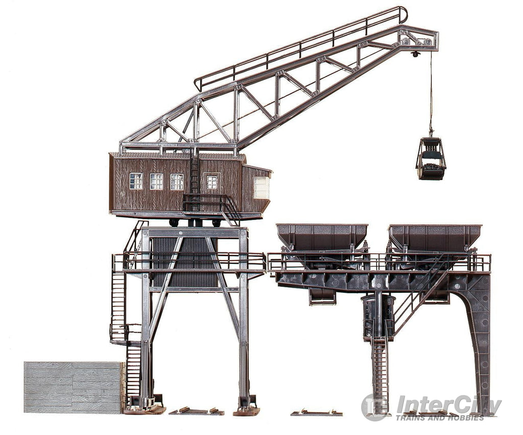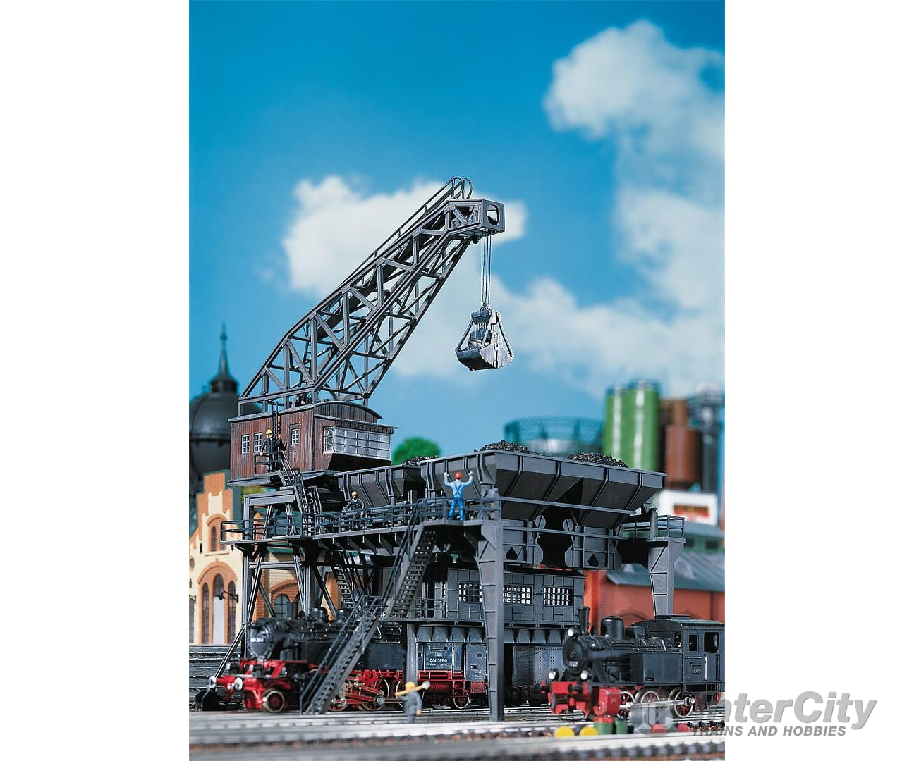 Prototypical coaling facility complete with concrete blockhouse, two coal conveyors (170 mm each), gantry crane and a bag of »coal« as realistic decor.
