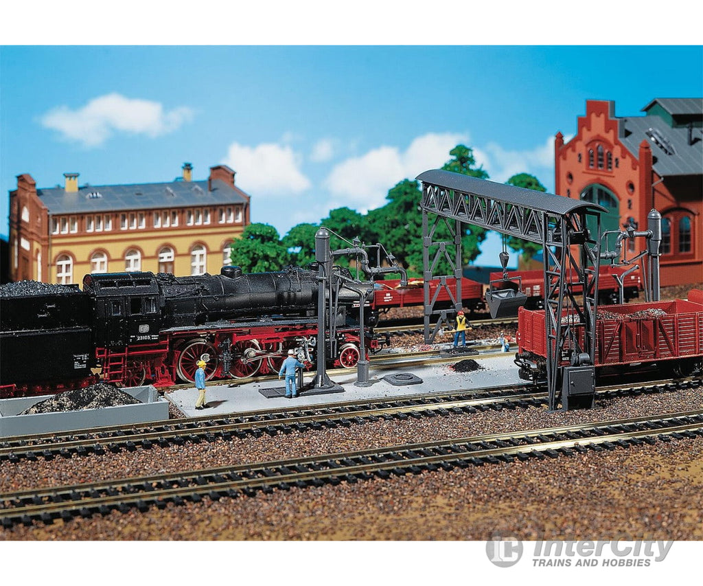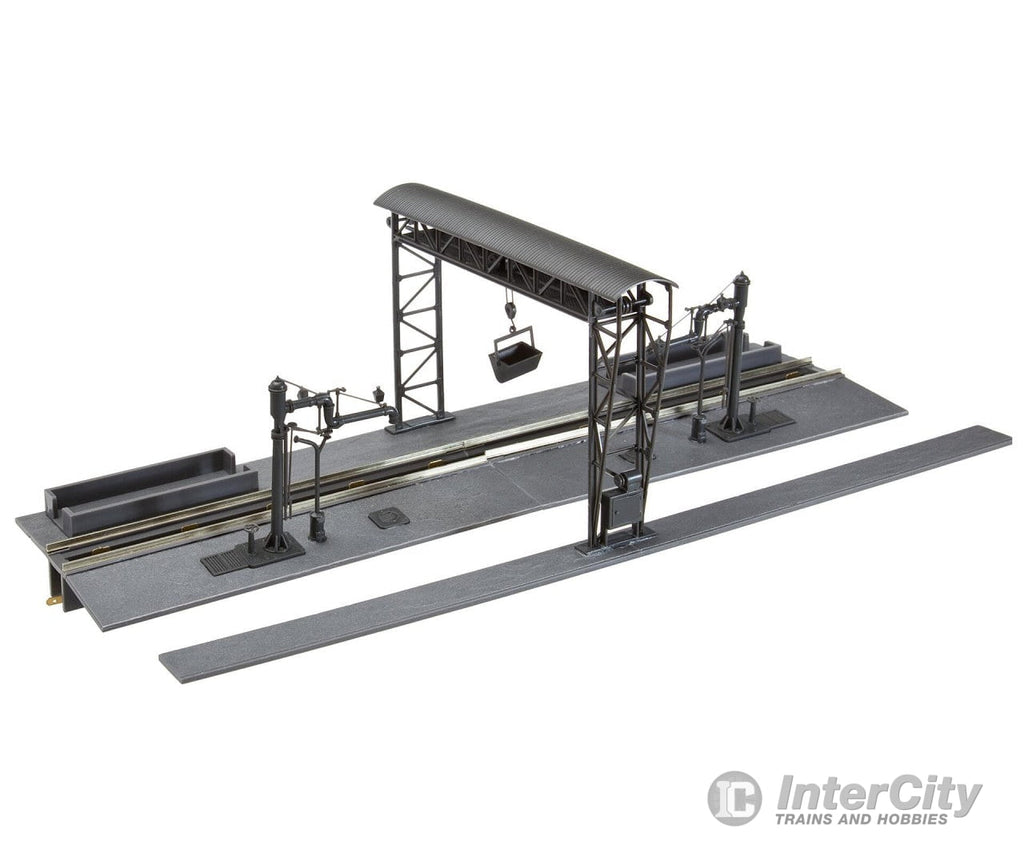 Kit includes a gantry crane, 2 heated swivel water spouts (DB NW 200), 2 slag hoppers, 1 ground plate (344 mm) with slag pit, rolling slag carriage, and bucket. Above the slag pit the ground plate is provided with two driving rails. It can be connected to all types of tracks, even those with middle conductor, except Märklin’s C track. Combining two inspection pits (120136) allows to build a two-track deslagging plant with a parallel track distance of 67 mm, matching that of the bunker (120148). Such an installation allows the gantry crane to span 3 tracks – 2 slag pits and 1 track for slag wagons.