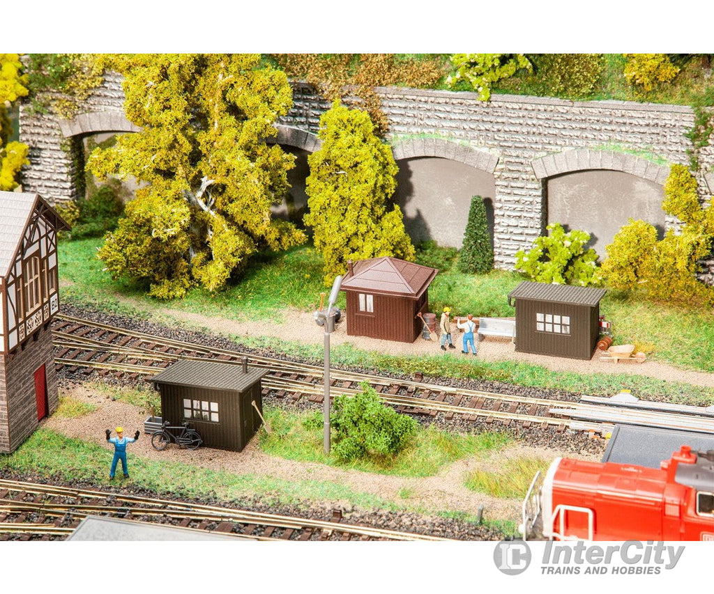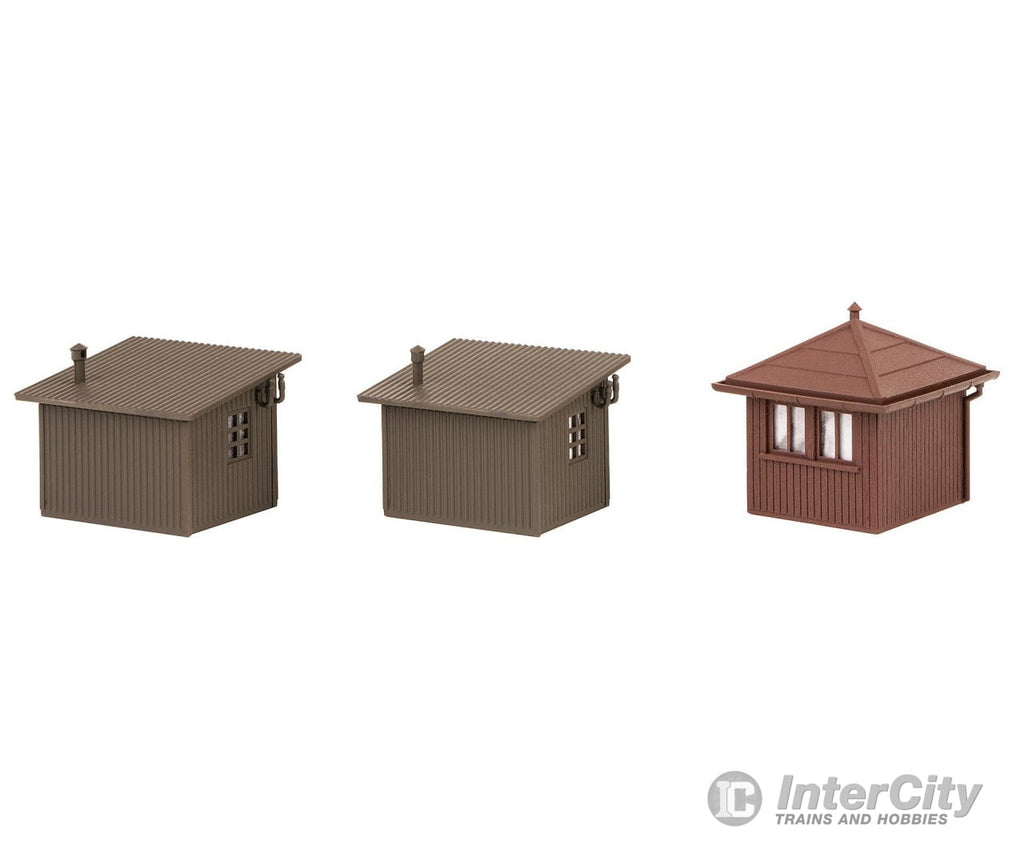 Along the railway line. Set including an engine driver waiting shelter with pavilion roof, and two trackside shanties with wooden board facing and lean-to roofs.