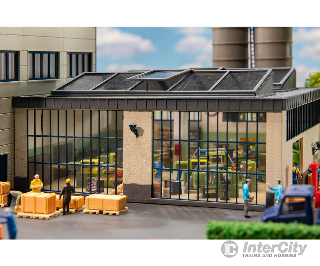 Production hall, cooling fan, two silos and a warehouse with office make a cohesive and interesting industrial theme for landscaping on a model railway layout. The production hall easily allows you to peak in and provides an unrestricted view of a wide range of accessories, in particular the well-equipped machine park with injection moulding machines.