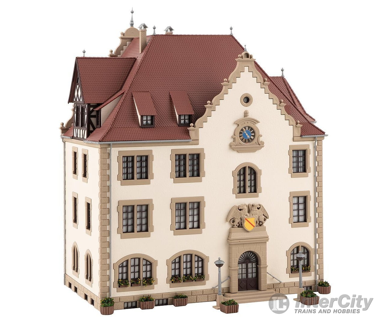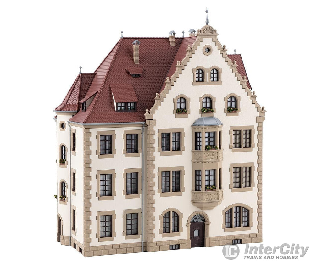 Representative, three-storey building model with façade elements that are elaborately designed, such as brick window trimmings, stepped gable and coat of arms, as well as a half-timbered gable cottage.