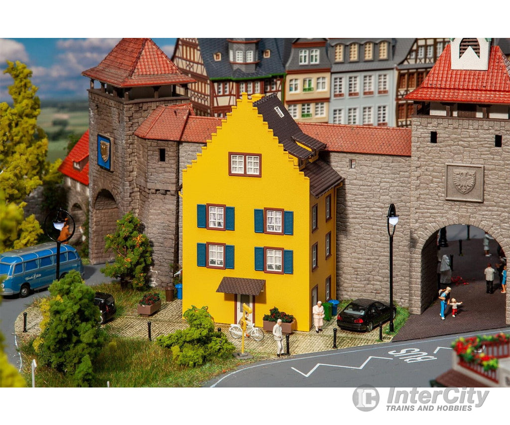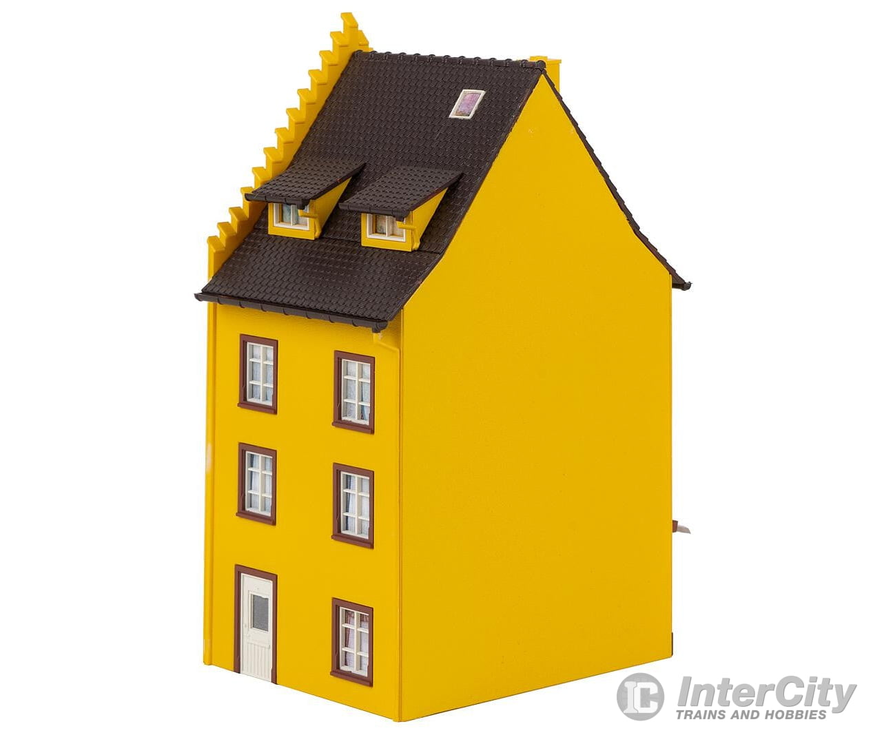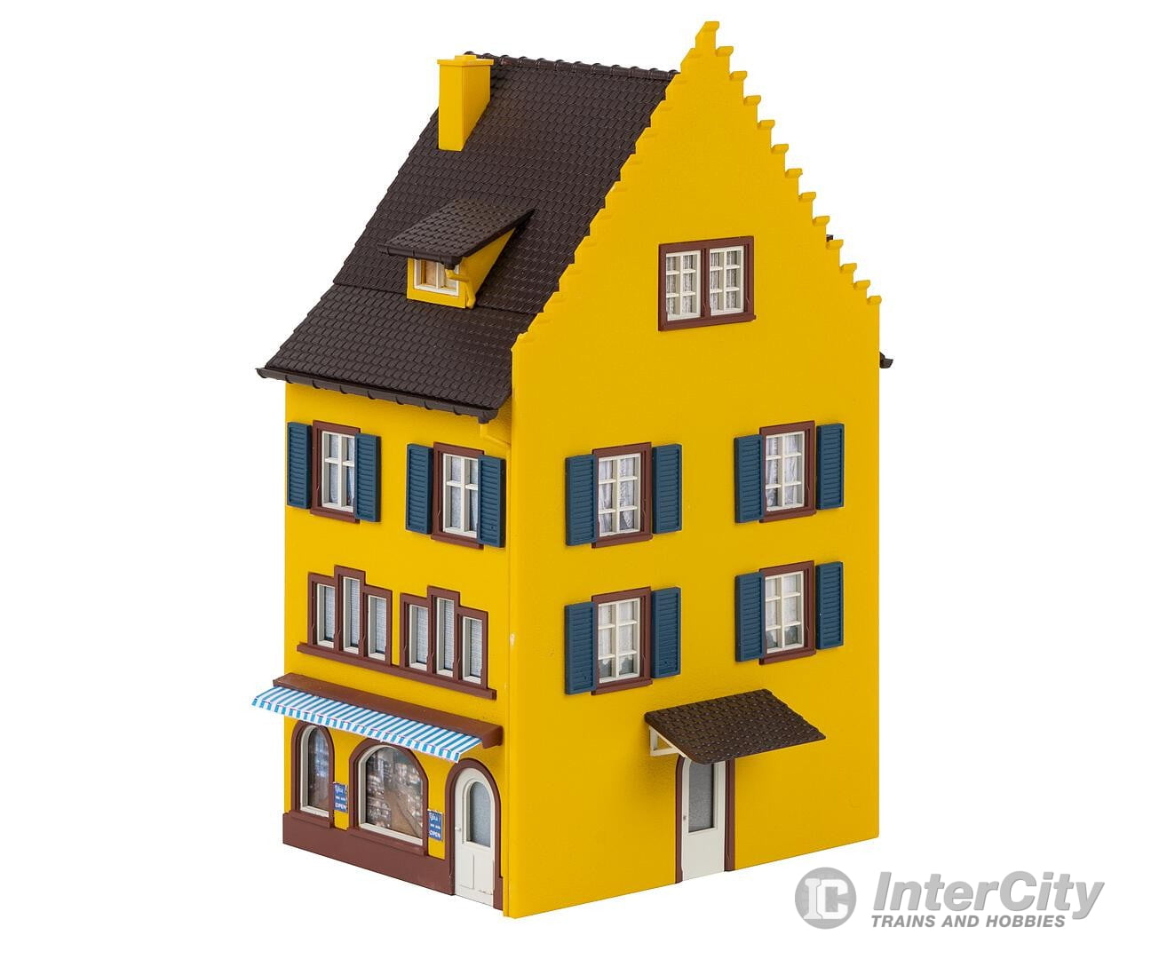 For your small town row of houses! Three-storey end-terrace house with a stepped gable, dormers and a shop on the ground floor.