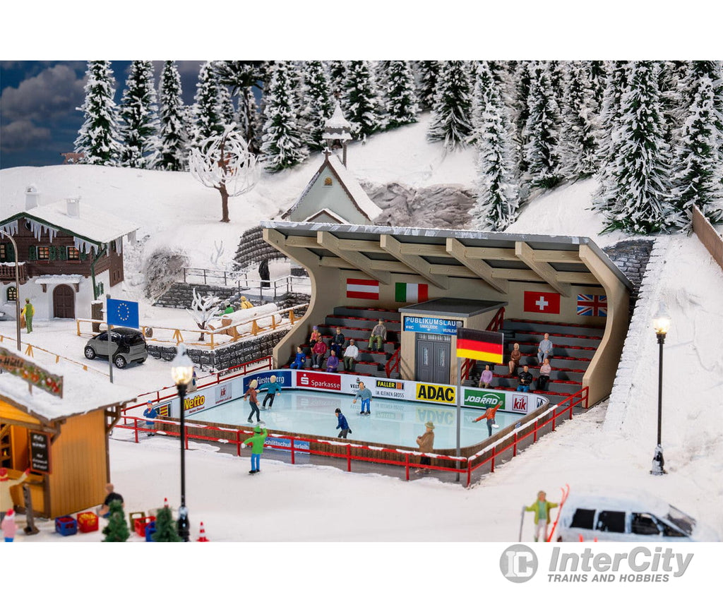 The five miniature figure skaters (movable) glide gracefully across the ice rink and breathe life into the winter set. The ice rink is overlooked by a grandstand with seats from which the action on the rink can be observed. Numerous national flags adorn the walls and poles. You almost feel like strapping on your skates and joining in! Contents: Artificial ice rink, ice skating figures (5 x), craft motor which drives the skaters (12-16 V, AC voltage)