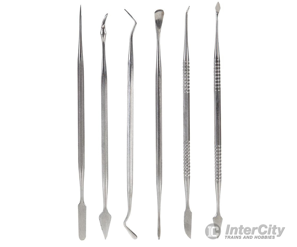 For all shaping work in the hobby workshop. Set containing 6 double spatulas with 12 tips and points of various shapes for any mixing, shaping, forming and rubbing work. Each spatula is made of stainless hardened fine steel and offers a perfect grip through its grooved handle.