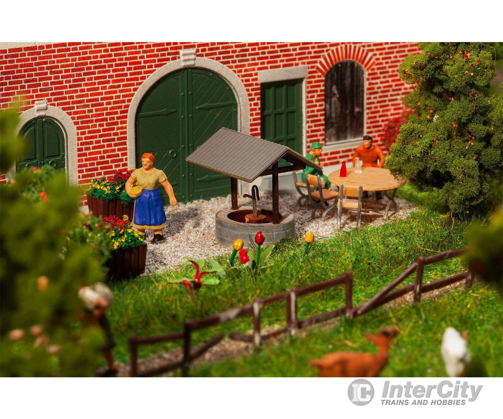Central element of a garden or village square! Lasercut model of a masonry decorative fountain with roofing and water pump. Model without function. 23 x 21 x 24 mm