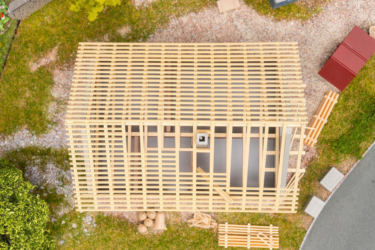 Construction, hammering and work in progress! Two houses are rising from the ground. One with a freshly started roof structure, the other still in the shell. A large silo, a blue construction trailer and lots of accessories bring real building site flair to the miniature world. Also included: hard-working builders who drill, screw and bring the set to life! Contents: Detached house under construction, house under construction, silo, construction trailer, 6 figures, toilet block, container, construction site sign, other accessories (wheelbarrows, pipes, stones, sacks, ladders, tools, etc.)