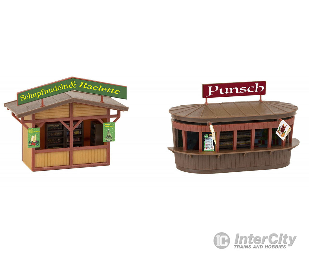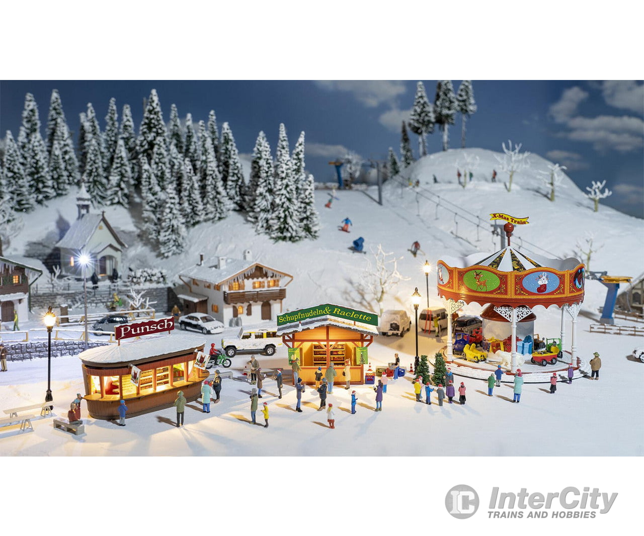 Cozy atmosphere at the Christmas market! Decoration set with two classic Christmas market stalls offering finger noodles, raclette and hot punch. Another experience on the H0 model railroad layout is offered by the X-mas train carousel (not a functional model), which lights up more than just children’s eyes. The carousel can be driven with the Synchronous hobby motor, Art. 180629 (not enclosed).