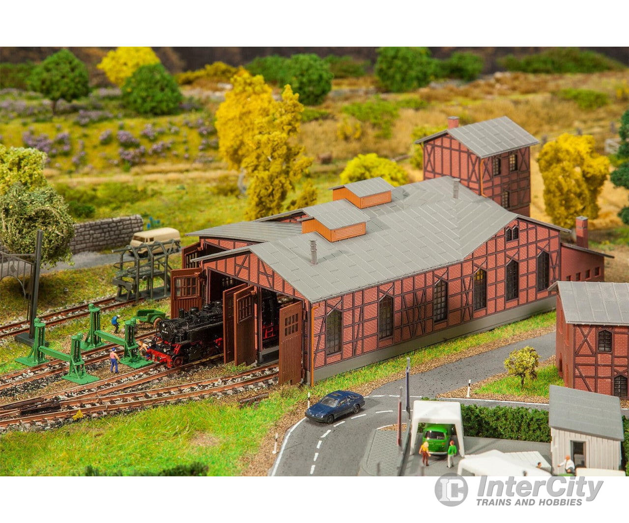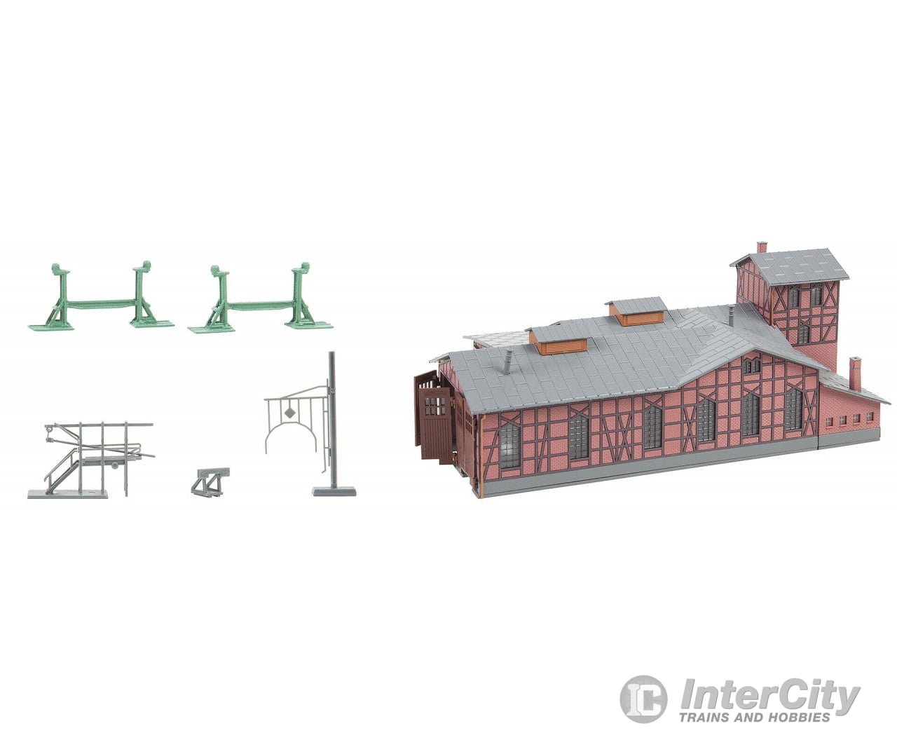 A FALLER highlight in new design. Set comprised of a three-stall engine house in half timbered building style with water tower at the rear. For engines up to 162 mm length over buffers, gate height 36 mm, spacing of tracks from centre to centre 37 mm. Set also includes two floor jacks with supports, a locomotive tube cleaner, a water sprout and a loading gauge.