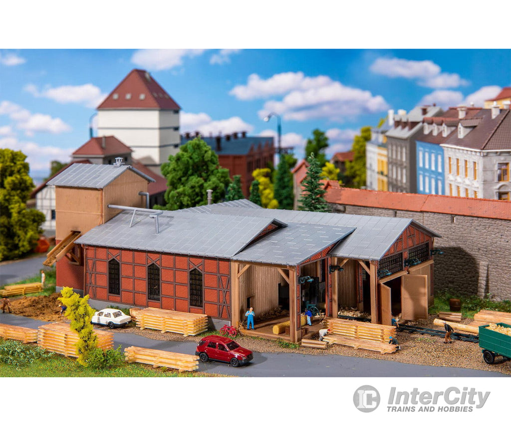 Sawmill in clinker brick/half-timbered construction, with attached sawdust tower, small trestle crane and typical decorative elements.