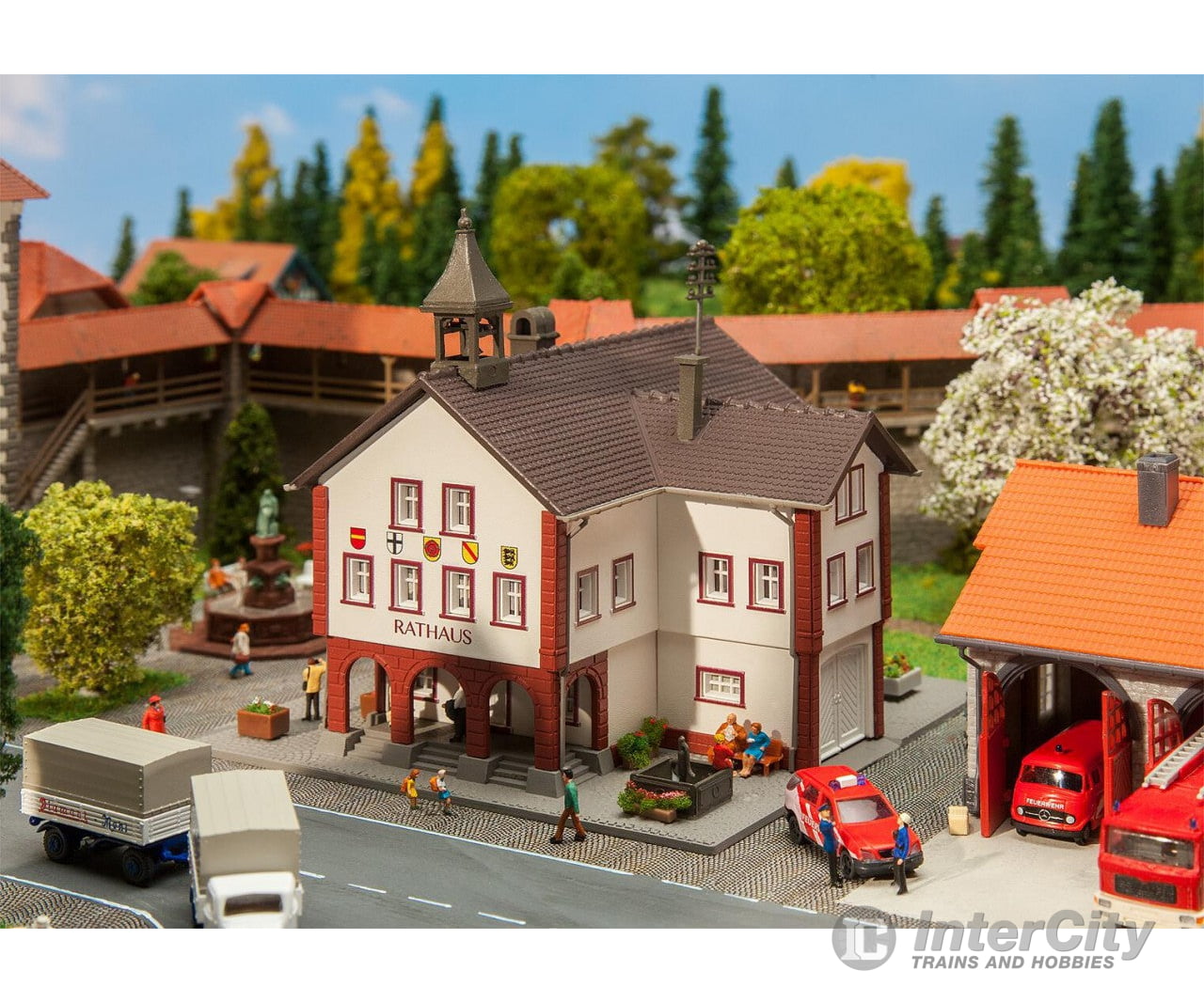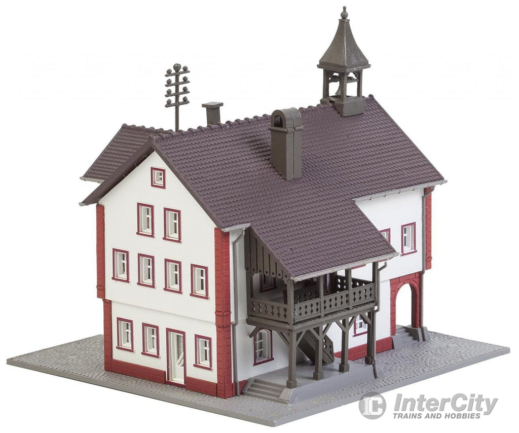 Three-storey small-town city hall with third gable, arcade passageway and lateral balcony with access stairs under a lean-to roof. A floor plate, a small bell lantern and a fountain are also part of that model featuring a gable wall with digital printing.