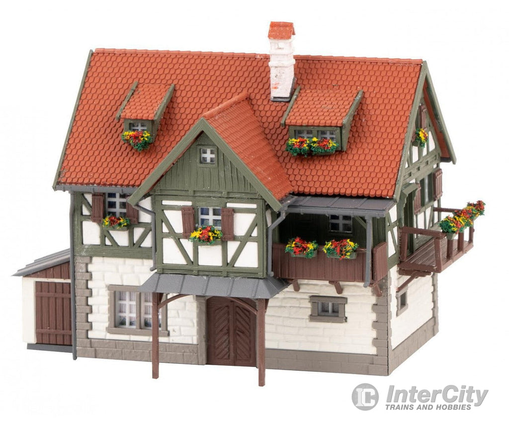 Rural, two-storey forest superintendent’s office with half-timbered first floor, dormer windows and third gable. An adjoining tool shed, a wooden balcony, a kennel, and flower boxes all contribute to the many-sided styling of the model.