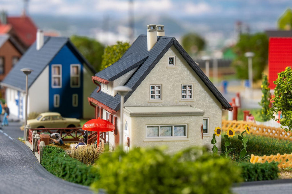 A grey detached house with a fenced front garden and brown shutters. Perfect for a small model family or to decorate the suburbs.