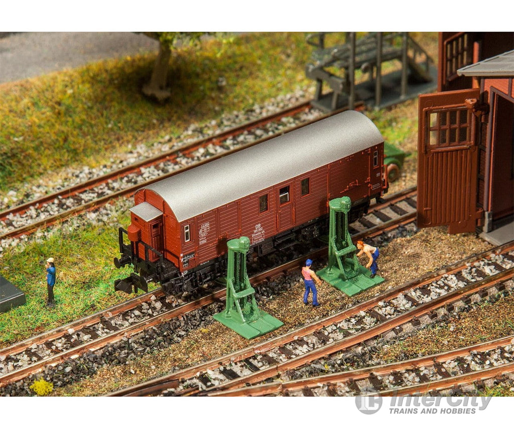 Lifting jacks with supports for the maintenance and repair of rail vehicles at the wagon depot. Equipped for the illustration of the operation with a motor. Non-functional model.