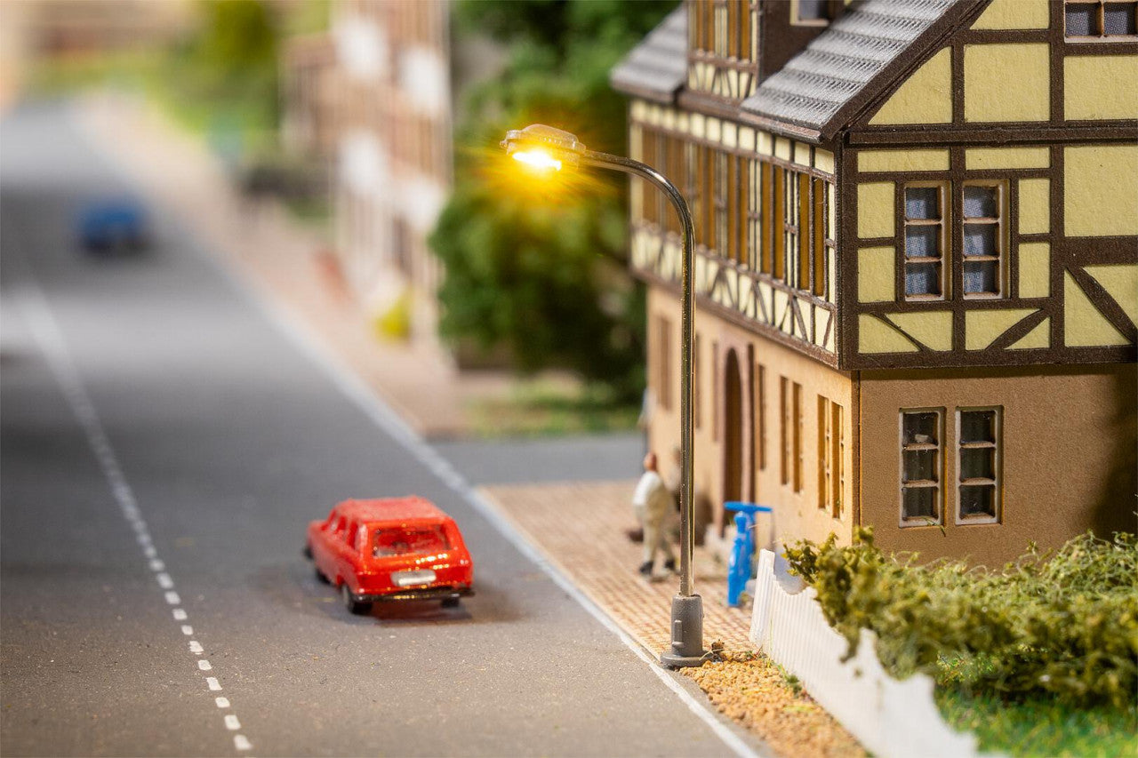Modern and widely used whip luminaire. Particularly suitable for designing urban, street and industrial scenes. The filigree luminaire is equipped with long-life LED technology. Height: 30 mm. Light colour: warm white. The product is ready for connection for: 12 V DC. Use the transformer, Art. 180641, to operate the light.