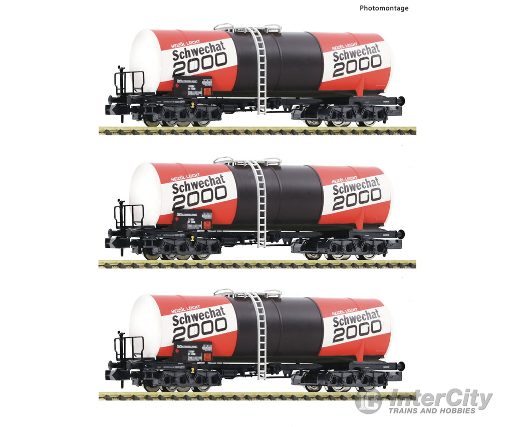 Wagon set with three 4-axle tank wagons of the Österreichischen Mineralöl Vertriebsgesellschaft (ÖMV), operated by the Austrian Federal Railways.