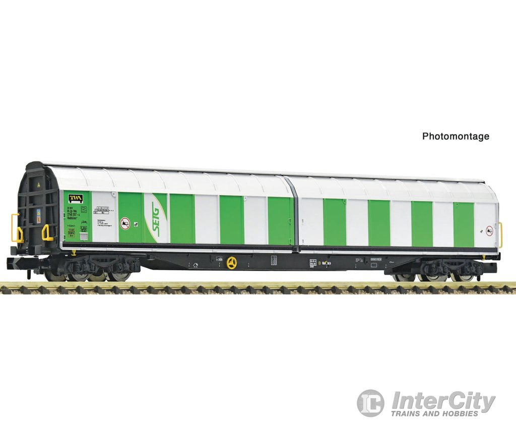 Four-axle high capacity sliding wall wagon, type Habbiins, of the Salzburger Eisenbahn Transport Logistik (SETG).
