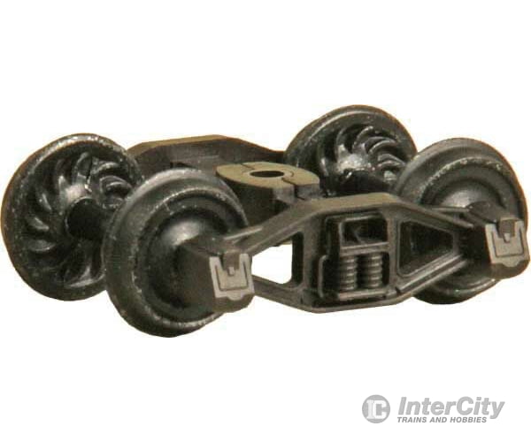Kadee HGC 2-Piece Trucks for HOn3 narrow gauge cars are made of a high-gravity metal-plastic hybrid compound (HGC) that weighs almost as much as metal. The two-piece design allows full equalization without need for springs. Truck sets include center bushing adapters for attaching the trucks to various makes of cars. The trucks require a flat mounting surface and some models may require trimming and filing of the car's bolster to make a flat surface. The bushings are designed for the original screws or where appropriate 0-48 self-tapping, 0-80 machine screws, or 1mm to 1.25mm metric equivalent. HGC 2-Piece Trucks include 26" ribbed-back RP-25 contour metal wheels, insulated axles and three assorted metal mounting bushings.