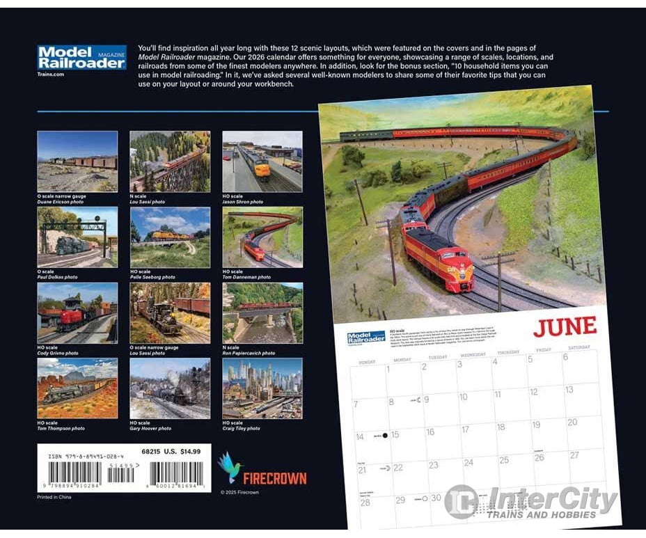 The 2026 Model Railroader Magazine Calendar from Firecrown offers something for everyone, showcasing a range of scales, locations, and railroads from some of the finest modelers around. You'll get to enjoy 12 scenic layouts that were featured in the pages of Model Railroader magazine. In addition, we included a bonus section featuring "10 household items you can use in model railroading." In it, several well-known modelers share some of their favorite tips that you can use on your layout or around your workbench.National holidays and occasions are highlighted, and there is ample room to add notes and appointment reminders. The 2026 Model Railroader Magazine Calendar is a great addition to your train room or office! Measures 13 x 10.5" Check out the entire range of 2026 railroad calendars from Firecrown.
