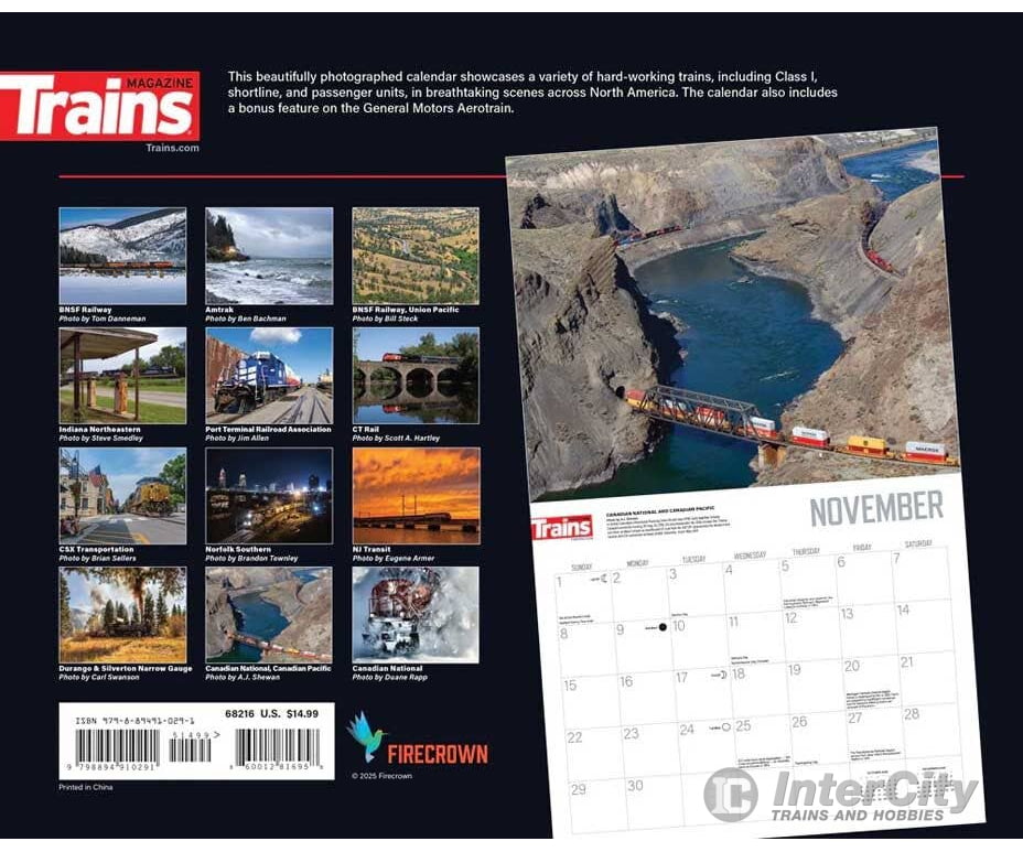 The 2026 Trains Across America Calendar from Firecrown captures a variety of moving trains in breathtaking scenes across the country. You can enjoy moving trains in breathtaking scenes across the country in this exclusive railroading calendar! This beautifully photographed calendar showcases a variety of hard-working trains, including Class I, shortline, and passenger units, in breathtaking scenes across North America. The railroading calendar also includes a bonus feature on the General Motors Aerotrain. The 2025 Trains Across America Calendar is a great addition to your train room or office! Measures 13 x 10.5" Check out the entire range of 2026 railroad calendars from Firecrown.