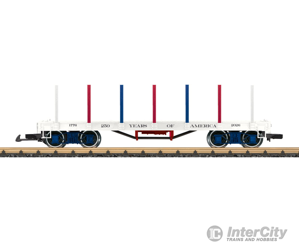 2026 repeats the signing of the Declaration of Independence in America. LGB is bringing out a special car for this anniversary. It is a flat car in the US colors. The car floor is extensively imprinted with various images of the theme of independence. There is a suitable load of the Liberty Bell. Stakes in the US colors are included. There are metal wheelsets. Length over the couplers 42 cm / 16-1/2".