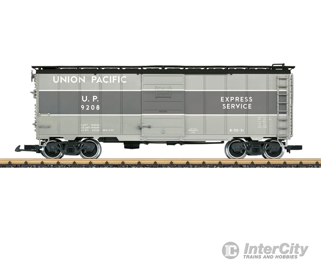This is a model of a Union Pacific "Express Service" boxcar. The silver paint scheme and lettering are correct for Era III. There are many separately applied details and the sliding doors can be opened. There are metal wheelsets. Length over the couplers 46 cm / 18-1/8".