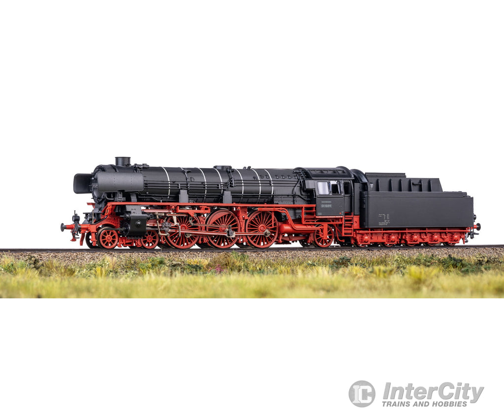Prototype: German Federal Railroad (DB) class 01.10 express steam locomotive with a new high-performance boiler design and a type 2'3 T38 tender. Black basic paint scheme with red running gear. Version without streamlined fairing. The model features silver boiler bands. Dual headlights. Witte smoke deflectors and an inductive magnet on one side. Loco road number 01 1059. The loco looks as it did after the boiler conversion around 1955/56.