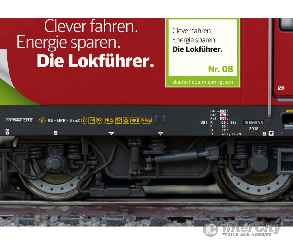 Model: The locomotive has an mfx+ digital decoder and extensive sound functions. It also has controlled high-efficiency propulsion. 4 axles powered. Traction tires. The triple headlights and dual red marker lights change over with the direction of travel, will work in conventional operation, and can be controlled digitally. Long-distance headlights can be controlled separately. The cab lighting can be controlled digitally. The control desk lighting can be controlled digitally. The headlights at Locomotive Ends 2 and 1 can be turned off separately in digital operation. When the headlights are off at both ends, the double "A" lights are on at both ends. Maintenance-free warm white and red LEDs are used for the lighting. Brake hoses for mounting on the locomotive are included. There is a figure of an engineer in Cab 1.
