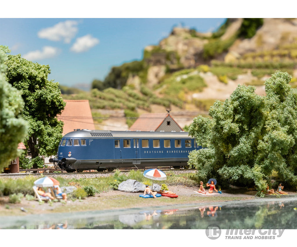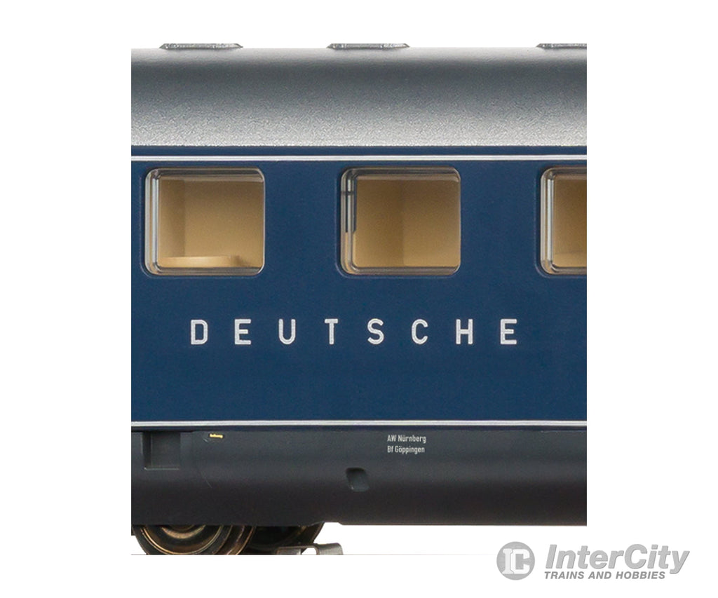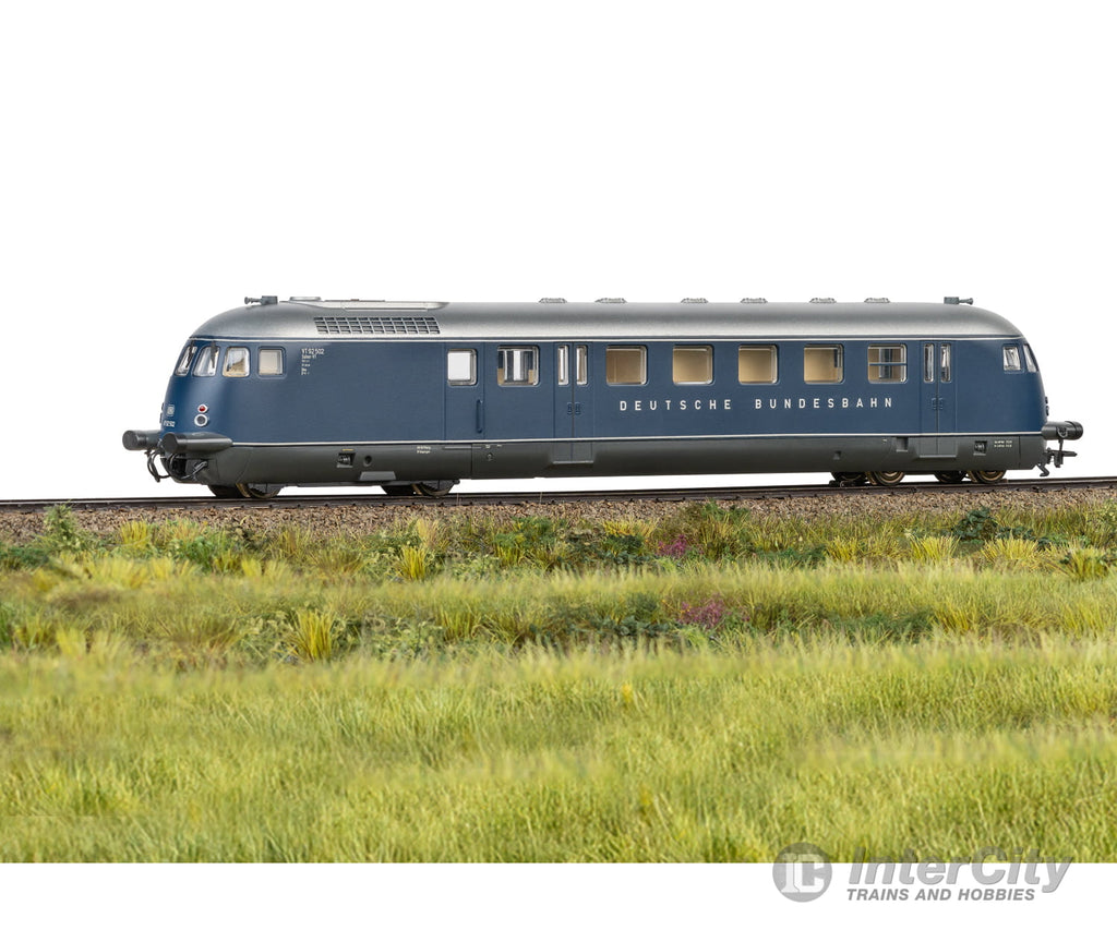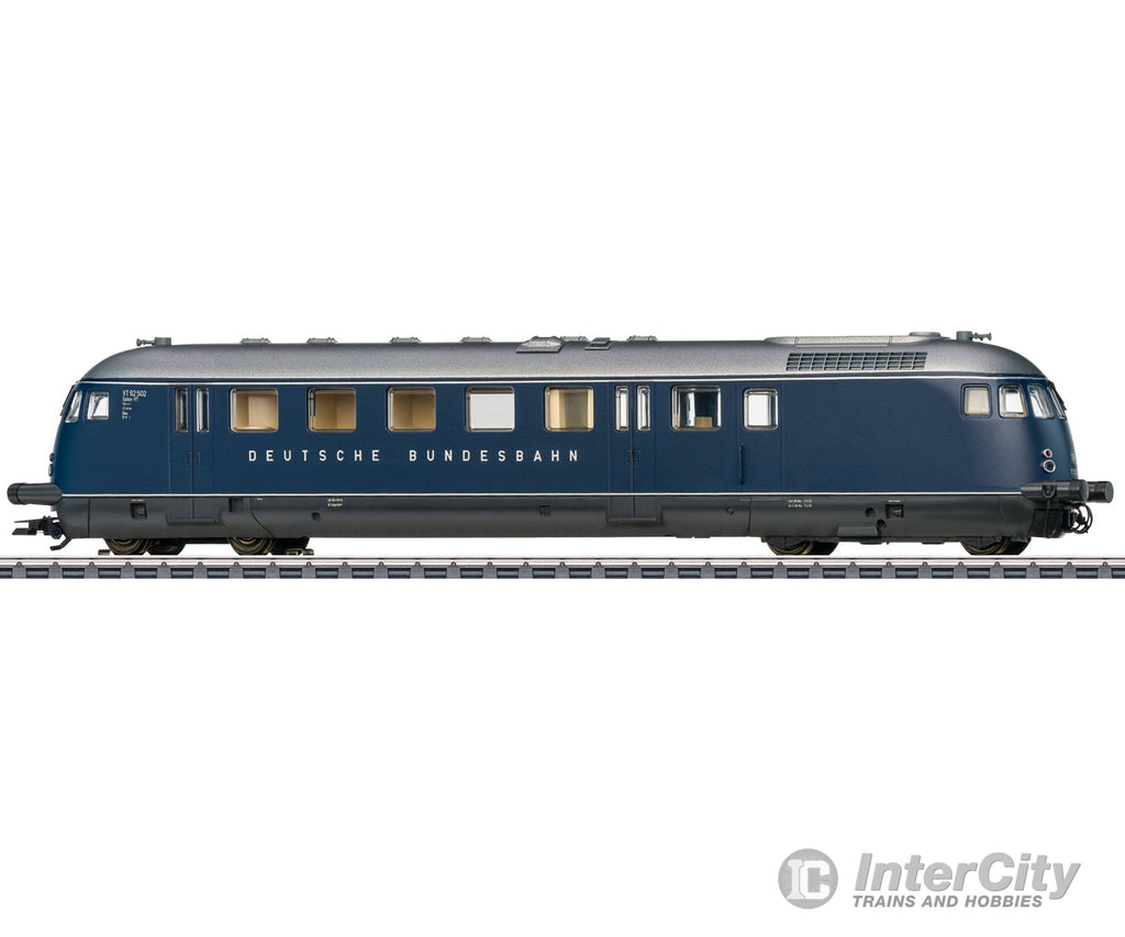 Prototype: German Federal Railroad (DB) class VT 92.5 four-axle diesel-powered rail car as a salon powered rail car. Steel blue basic paint scheme. Buffer cladding included. Powered rail car road number VT 92 502 based on the F-Zug network of fast trains. The car looks as it fictitiously did around 1956.