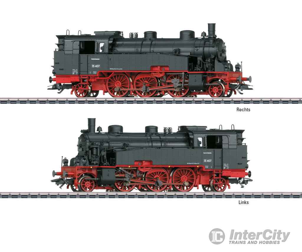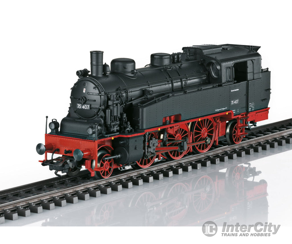 Prototype: German Federal Railroad (DB) class 75.4 steam tank locomotive (former Baden VI c). Version with dual headlights, smoke box door with central locking, and riveted water tanks. Road number 75 407. The locomotive looks as it did around 1953.