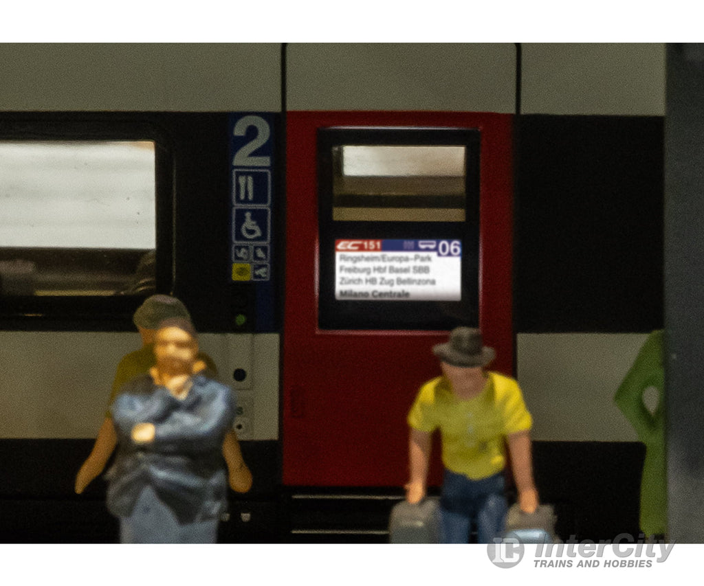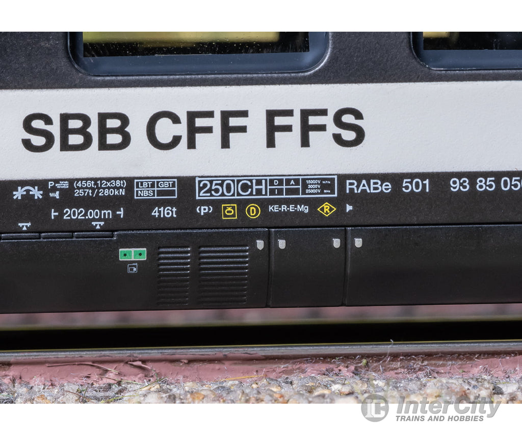 Prototype: Swiss Federal Railways (SBB) EC 250 electric high-speed rail car train as the class RABe 501 "Giruno". 1 type A (Bt1) end car, 2nd class. 1 type F (B7) intermediate car, 2nd class, with handicapped entries and a pantograph. 1 type G (WR6) intermediate car, with a dining area. 1 type H (A5), 1st class, with handicapped entries and a pantograph. 1 type L (At2) end car, 1st class. Multiple system powered railcar train. Reproduction of the EC 151, with cross border train route: Frankfurt/Main - Freiburg - Basle - Zürich - Milan Central. Train number RABe 501 022, with the coat-of-arms of the Canton of Vaud. The train looks as it did around 2024.