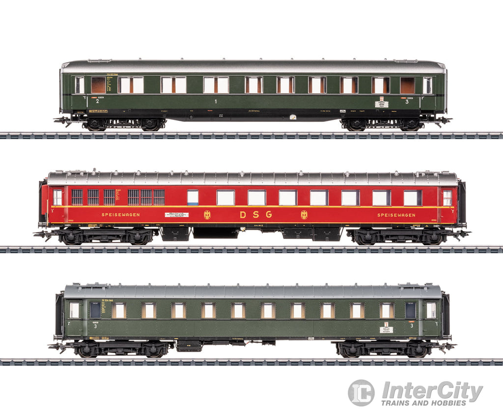 Prototype: An express train passenger car set comprising the following three cars of different types for the "D 74" express train. 1 type ABC4üwe four-axle skirted passenger car, 1st/2nd/3rd class. 1 DSG type WR4ü(e) four-axle dining car (standard design 1928-30). 1 type C4ü four-axle seating car, 3rd class (standard design 1928-30). Train route: D 74 Hamburg Altona - Basel SBB, for the Frankfurt/Basel SBB section of the route. German Federal Railroad (DB) and German Sleeper and Dining Car Company (DSG). The cars look as they did around 1955.