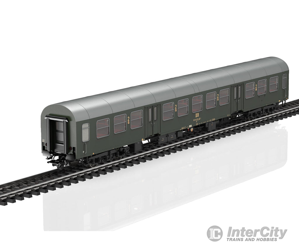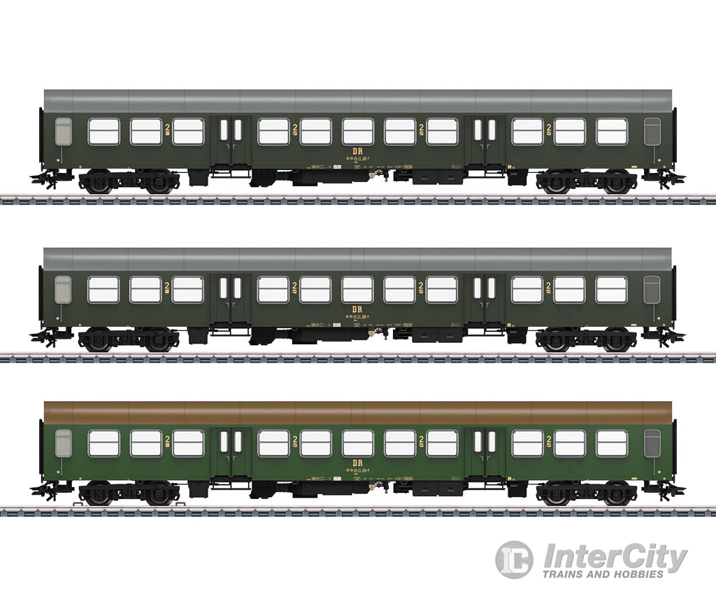 Prototype: Three German State Railroad (DR/GDR) type Bmh passenger cars, 2nd class. "Halberstadt Center Entry Car" design. Two cars in dark green (TGL 2233) and one car in chrome oxide green (TGL 2235) basic paint scheme. The cars looks as they did at the end of the Eighties.