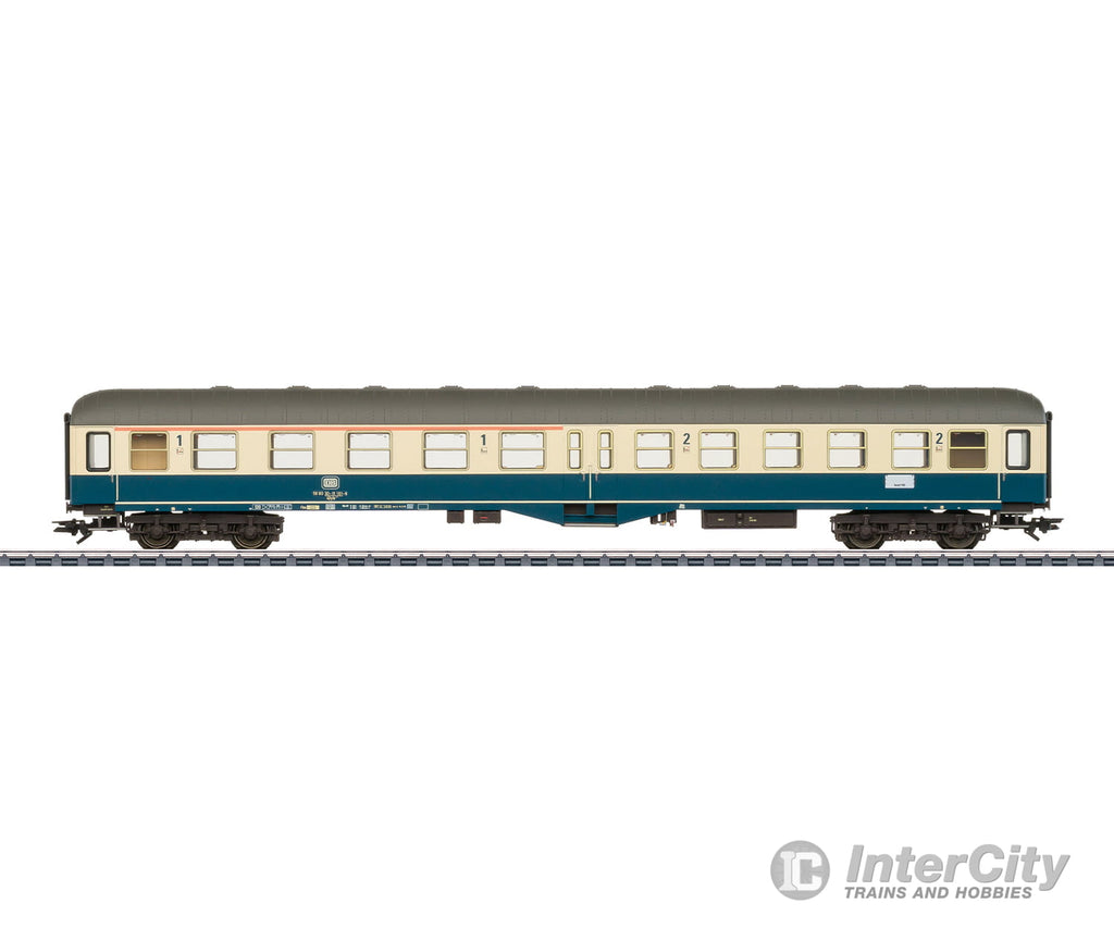 Prototype: German Federal Railroad (DB) passenger car, 1st/2nd class for so-called lightweight express trains (LS). Type ABylb 411. Commonly known also as "Center Entry Cars". Version with small marker lights mounted above at the ends of the car and single-piece windows on the entries at the end of the car. Ocean blue / ivory paint scheme. The car looks as it did around 1980.