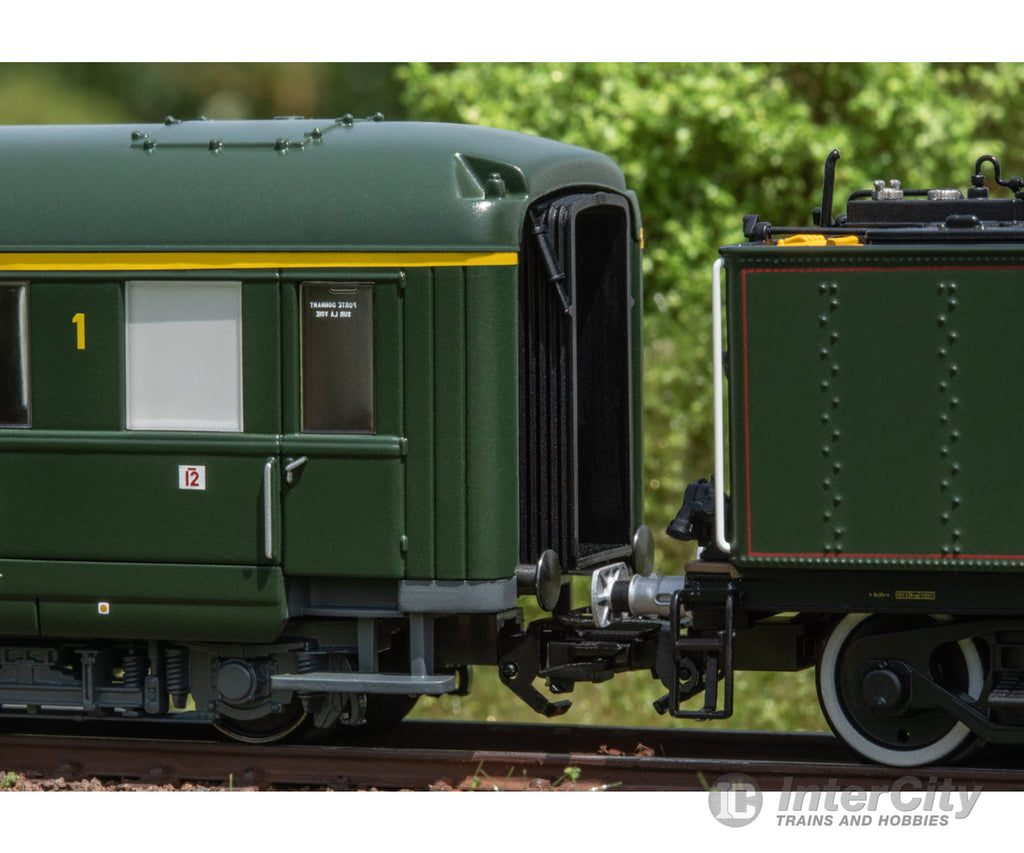 Prototype: 3 four-axle pass, the so-called "Schürzenwagen" / "Skirted Passenger Cars" from the prewar period. Several of these cars remained after World War II in France and entered SNCF ownership in this manner. This group of cars has a bottle green basic paint scheme corresponding to the way the cars looked in Era IV at the start of the Seventies.
