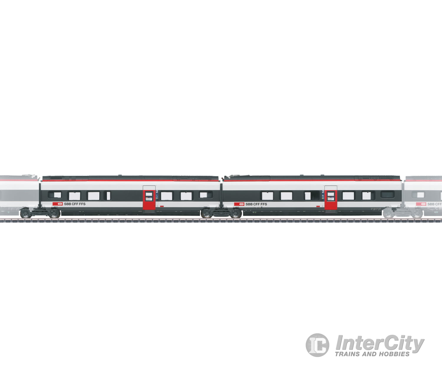 Prototype: Add-on cars for the Swiss Federal Railways (SBB) class RABe 501 "Giruno" high-speed powered rail car train. 1 type B (B11) intermediate car, 2nd class, with a pantograph. 1 type C (B10) intermediate car, 2nd class. The cars go with train number EC 151, with cross border train route: Frankfurt/Main - Freiburg - Basle - Zürich - Milan Central. Train number RABe 501 022 with the coat of arms for the Swiss canton Vaud. The cars look as they did around 2024.
