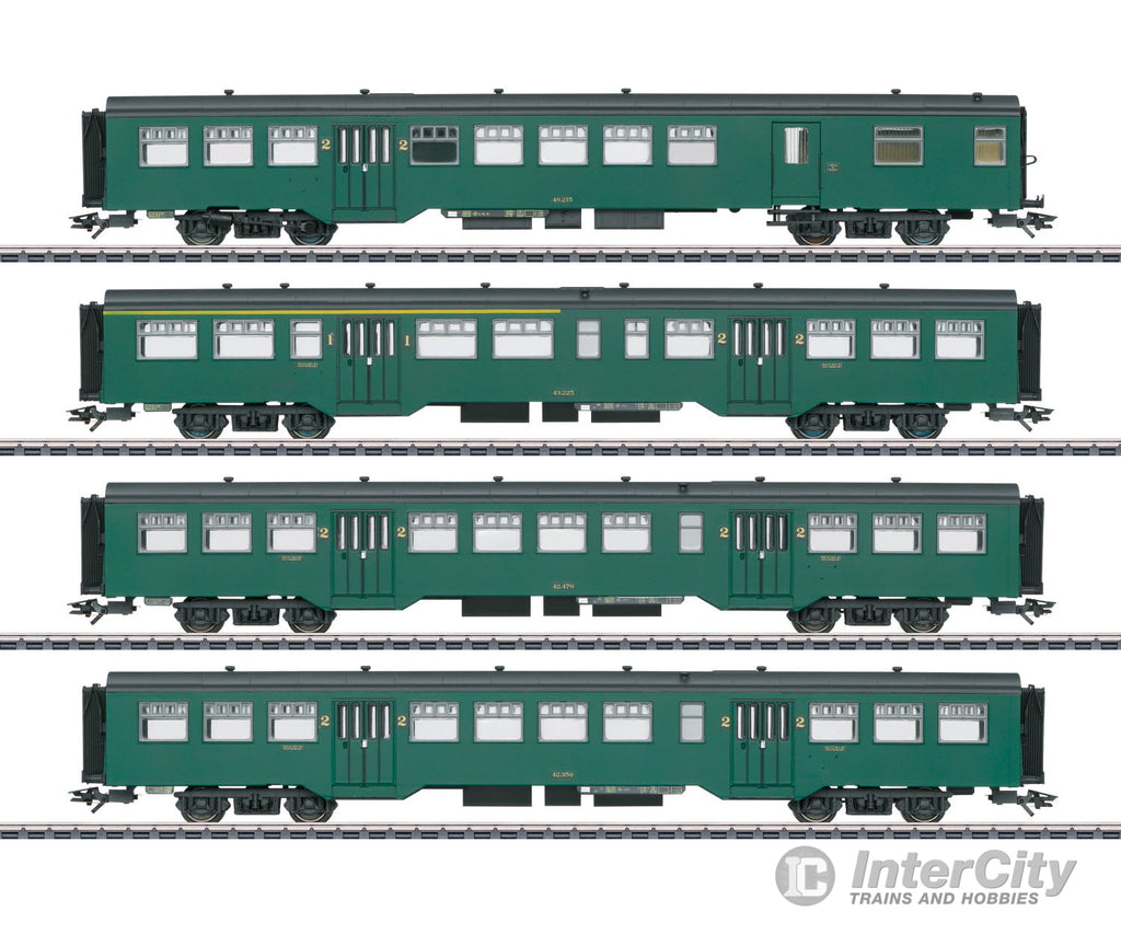 Prototype: 4 different Belgian State Railways (SNCB/NMBS) type M2 passenger cars. 2 type M2, B11 passenger cars, 2nd class. 1 type M2, A5B5, passenger car, 1st/2nd class. 1 type M2, B8D, passenger car with a baggage area, 2nd class. Moss green basic paint scheme. The cars look as they did in Era IIIa.