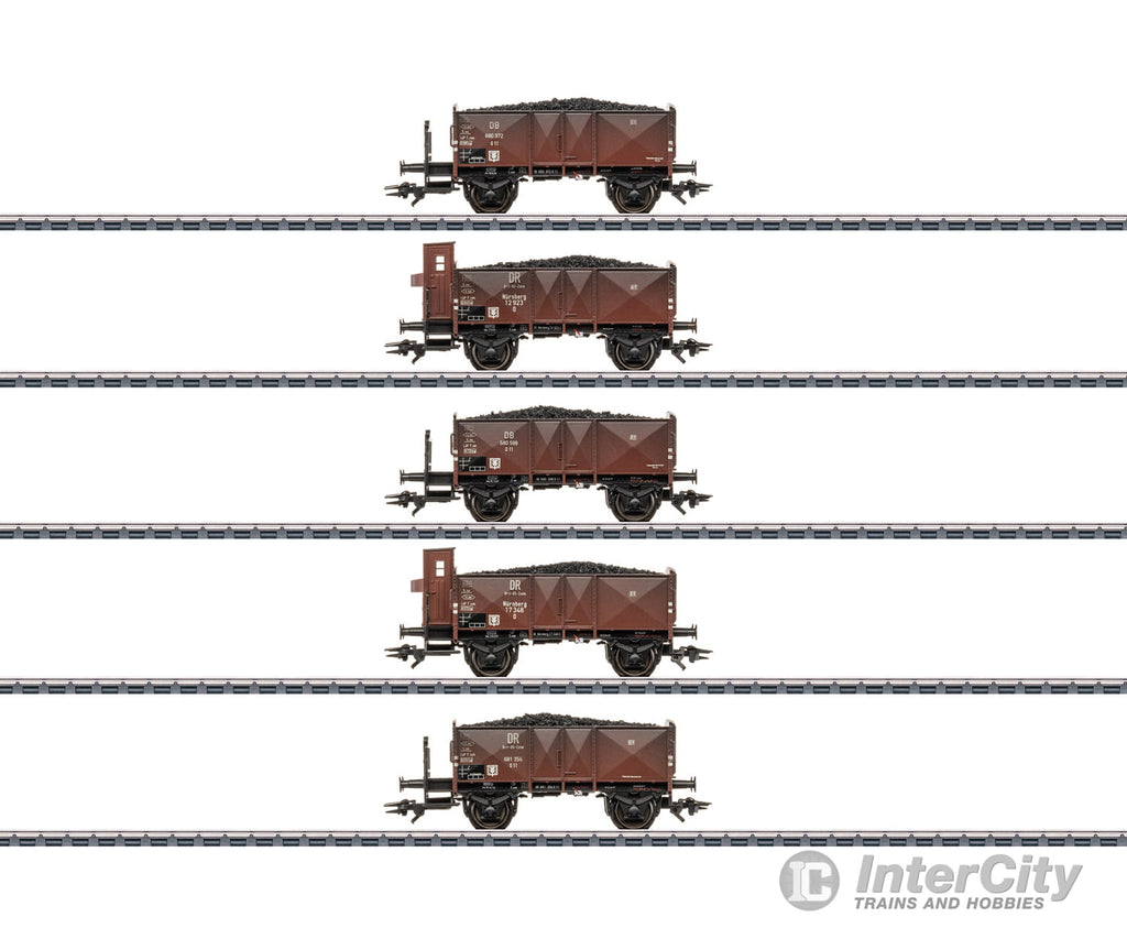 Prototype: Set of five German Federal Railroad (DB) type O11 and O Nürnberg, short, high-side gondolas. Reddish brown basic paint scheme. The cars look as they did around 1954.