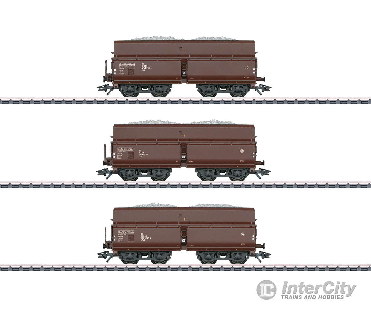 Model: The hopper cars have detailed construction with different car numbers. All of the cars have brakeman's platforms and set wheels at the ends. The hopper cars have scale sized load inserts. All of the cars are individually packaged and have a master package. Length over the buffers per car 11.5 cm / 4-1/2.DC wheel set E700580. Trix Express wheel set E258259.